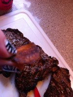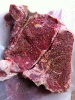 T-bones with Chicago Steak rub, marinated  with the rub on for a few hours, then grilled for about 8 minutes a side for medium well.