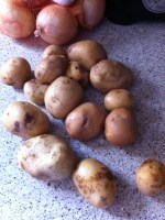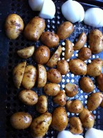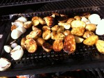 Potatoes also done on the grill.  They were locally grown and from the produce delivery place as well. I cut them in halfish, gave them a light coating of olive oil and some seasoning, I think I used a Chipotle rub.  I started these beofre anything else, along with the onions. They were probably on for at least 10 minutes before I turned them to the other side.  They turned out great, almost like crispy on the outside steak fries.