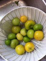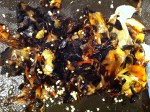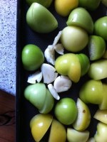 Tomatillos, peel papery skins, wash, cut in half. I roasted them on a baking sheet with a lip to hold the juices they release. I turn them cut side down and put the broiler on high. Keep an eye on them, about 15-20 minutes, until the skins get bubbly and brown or black and the pan is full of tomatillo juice.   I also throw the few cloves of garlic on the same pan  and roast them in the juices at the same time.   This batch I got busy and turned the oven off, but didn’t take the pan out.  This caused me to lose a lot of my juice to oven evaporation and make my sauce extra thick.   It was a happy mistake I think, but one I won’t be repeating on purpose.