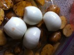 Onions, peel, cut in big chunks. You can put them on a pan with the tomatillos in the oven but I put them on the grill with the potatoes to get them semi-cooked and roasted.