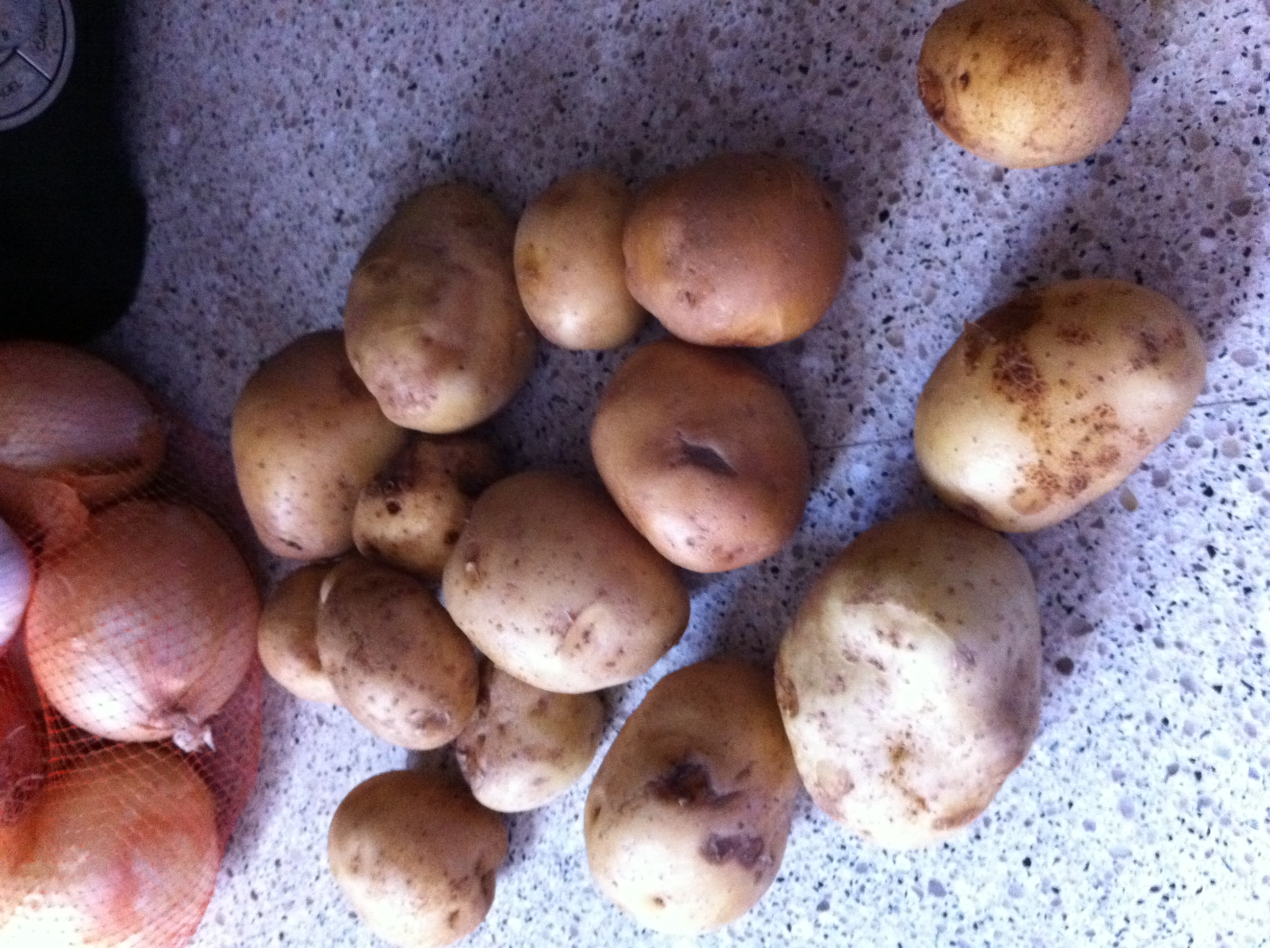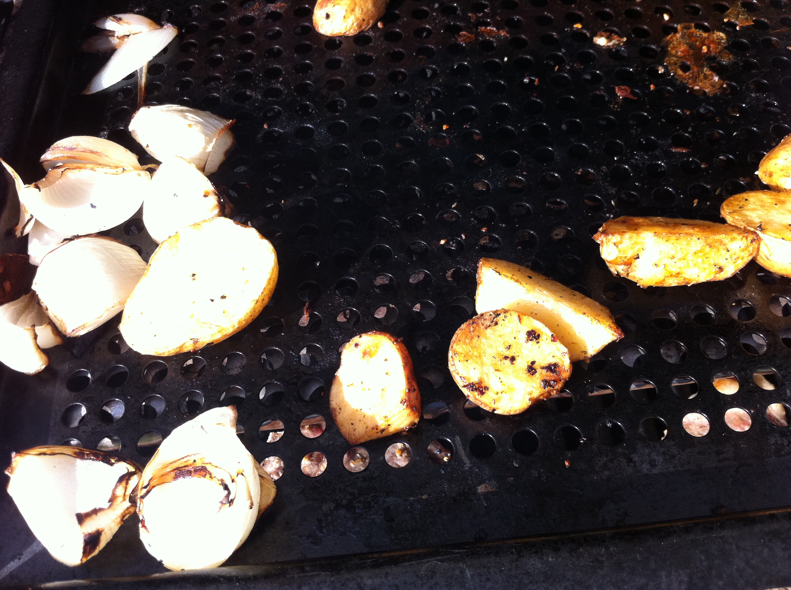 Potatoes also done on the grill.  They were locally grown and from the produce delivery place as well. I cut them in halfish, gave them a light coating of olive oil and some seasoning, I think I used a Chipotle rub.  I started these beofre anything else, along with the onions. They were probably on for at least 10 minutes before I turned them to the other side.  They turned out great, almost like crispy on the outside steak fries.