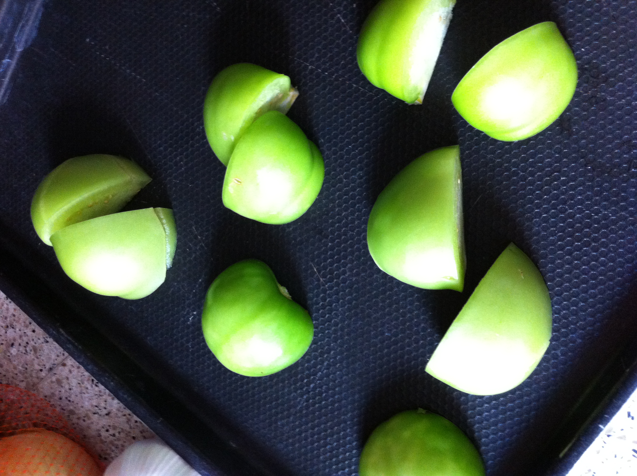Onions, peel, cut in big chunks. You can put them on a pan with the tomatillos in the oven but I put them on the grill with the potatoes to get them semi-cooked and roasted.
