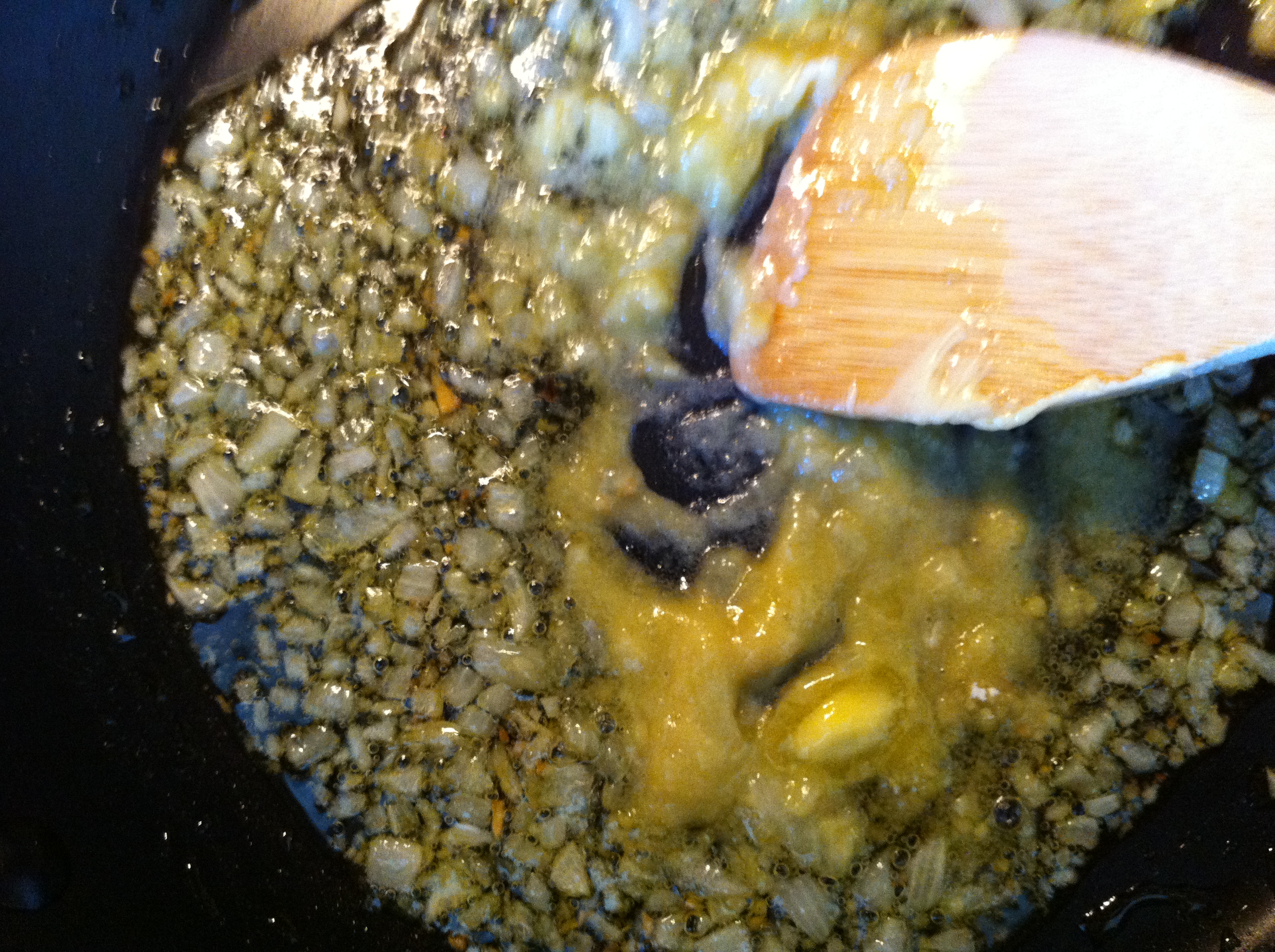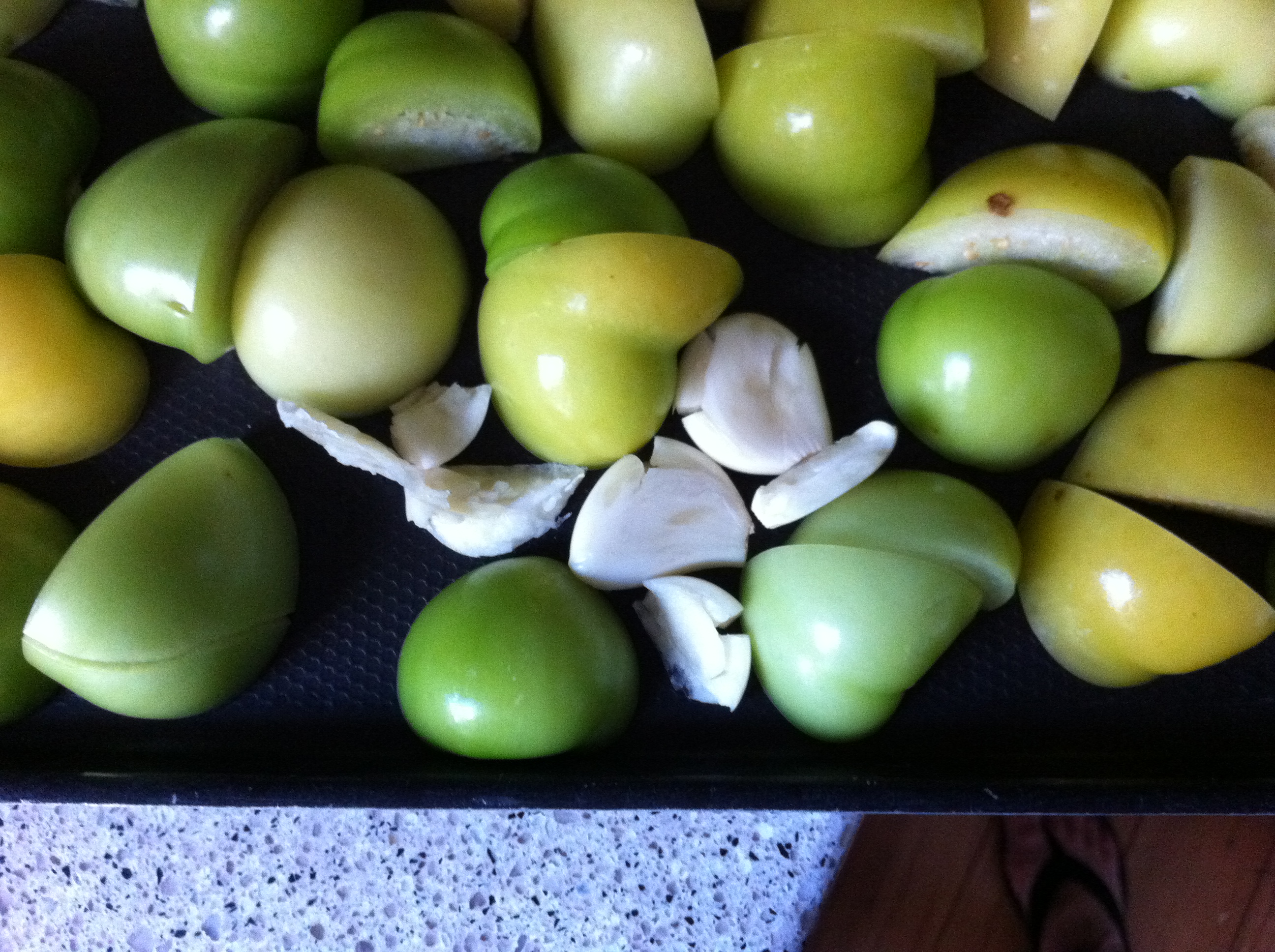 Tomatillos, peel papery skins, wash, cut in half. I roasted them on a baking sheet with a lip to hold the juices they release. I turn them cut side down and put the broiler on high. Keep an eye on them, about 15-20 minutes, until the skins get bubbly and brown or black and the pan is full of tomatillo juice.   I also throw the few cloves of garlic on the same pan  and roast them in the juices at the same time.   This batch I got busy and turned the oven off, but didn’t take the pan out.  This caused me to lose a lot of my juice to oven evaporation and make my sauce extra thick.   It was a happy mistake I think, but one I won’t be repeating on purpose.