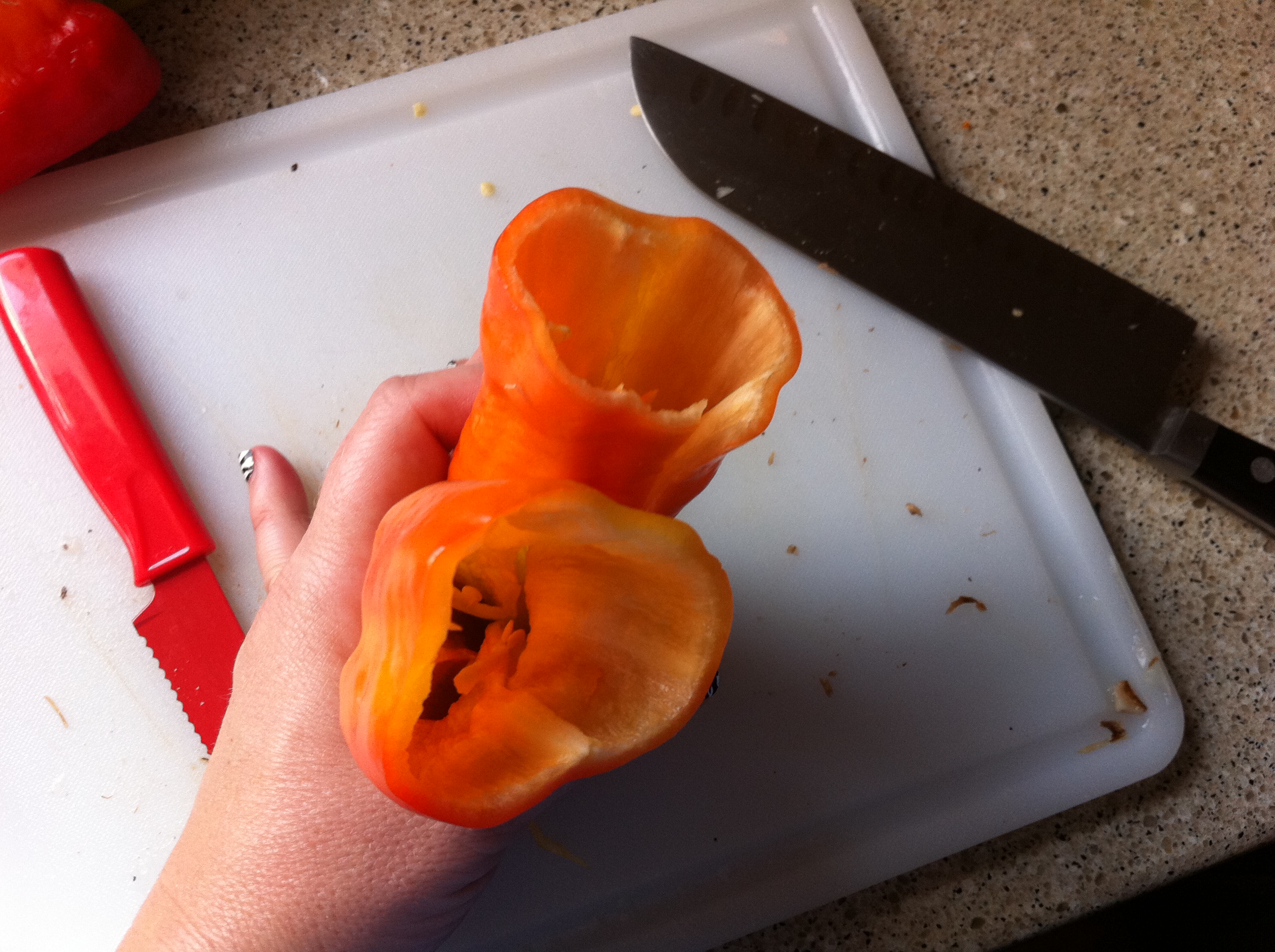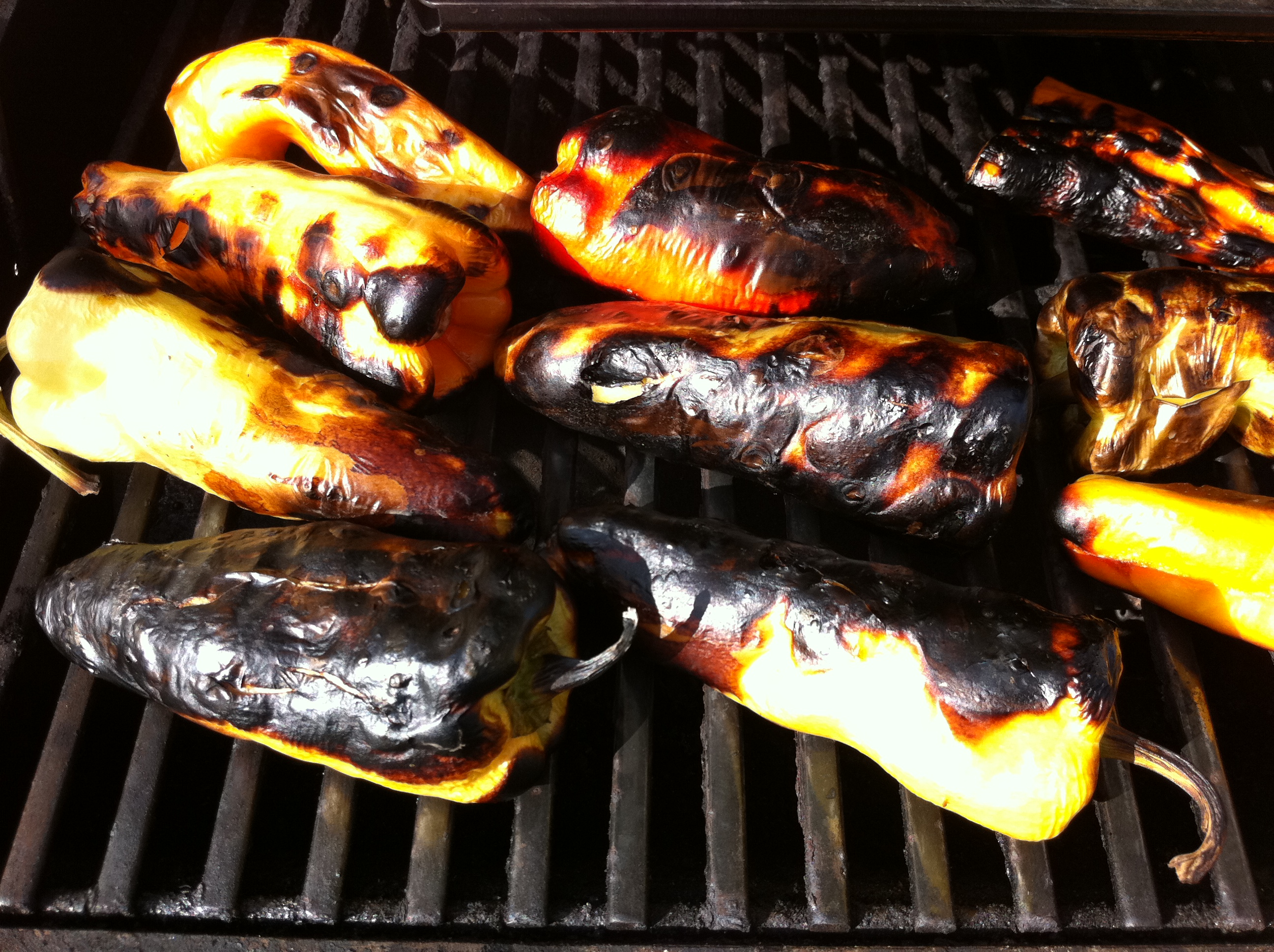 Peppers, I prefer pabloanos, but I have used all kinds of  peppers for this.  This batch was billed as a pablano/banana mix.  You can either cut the tops off and roast that way or roast whole and deal with the seeds later while you are peeling the stems and skins off.   Either way works, but the cut off in advance method may be a little less messy.  Roast in oven under broiler or on grill on bottom close to the fire until the skins are charred and black.   Then let them rest and peel off as much skin as is fit. There is a picture of the skin carcases somewhere here.