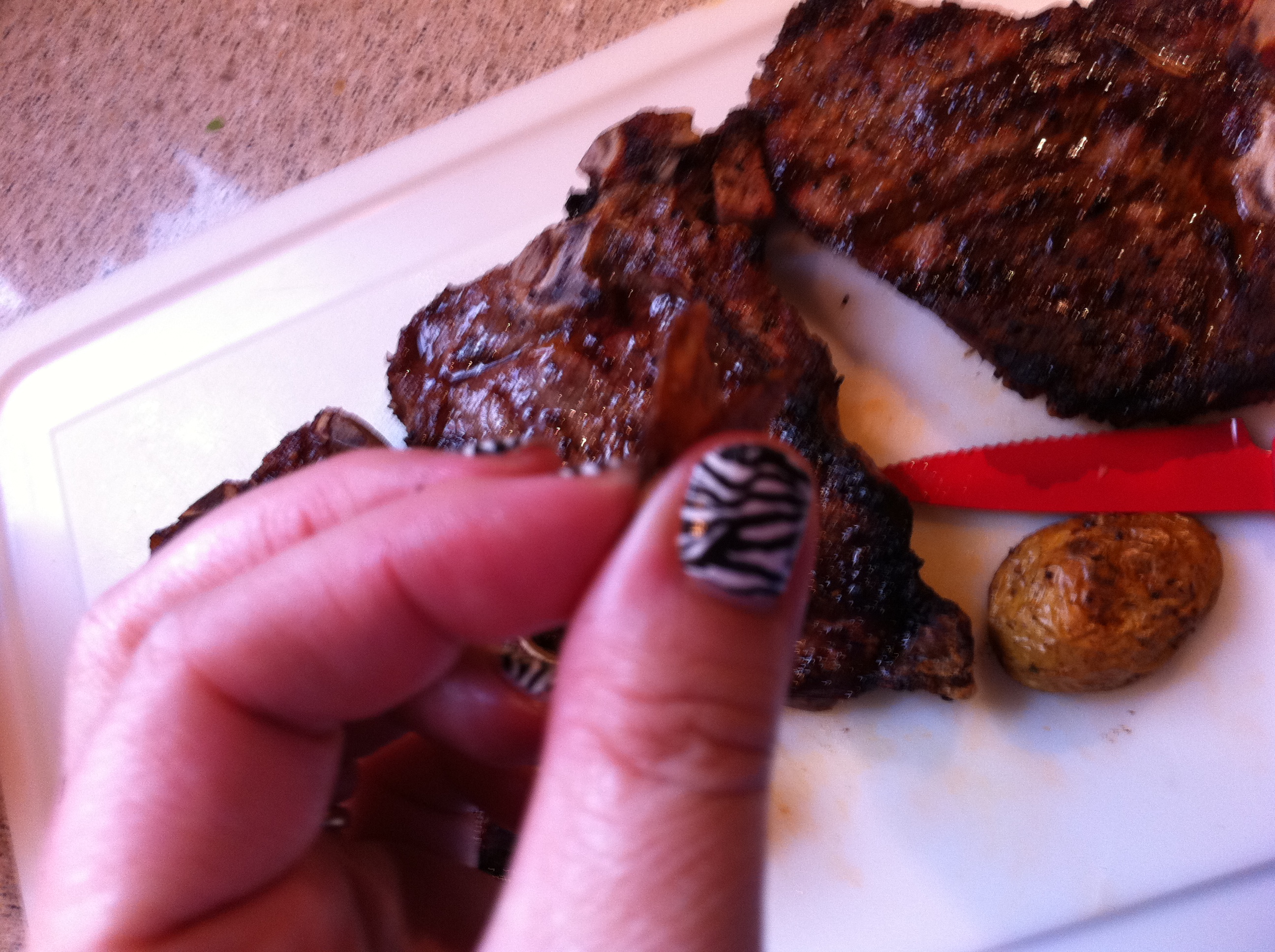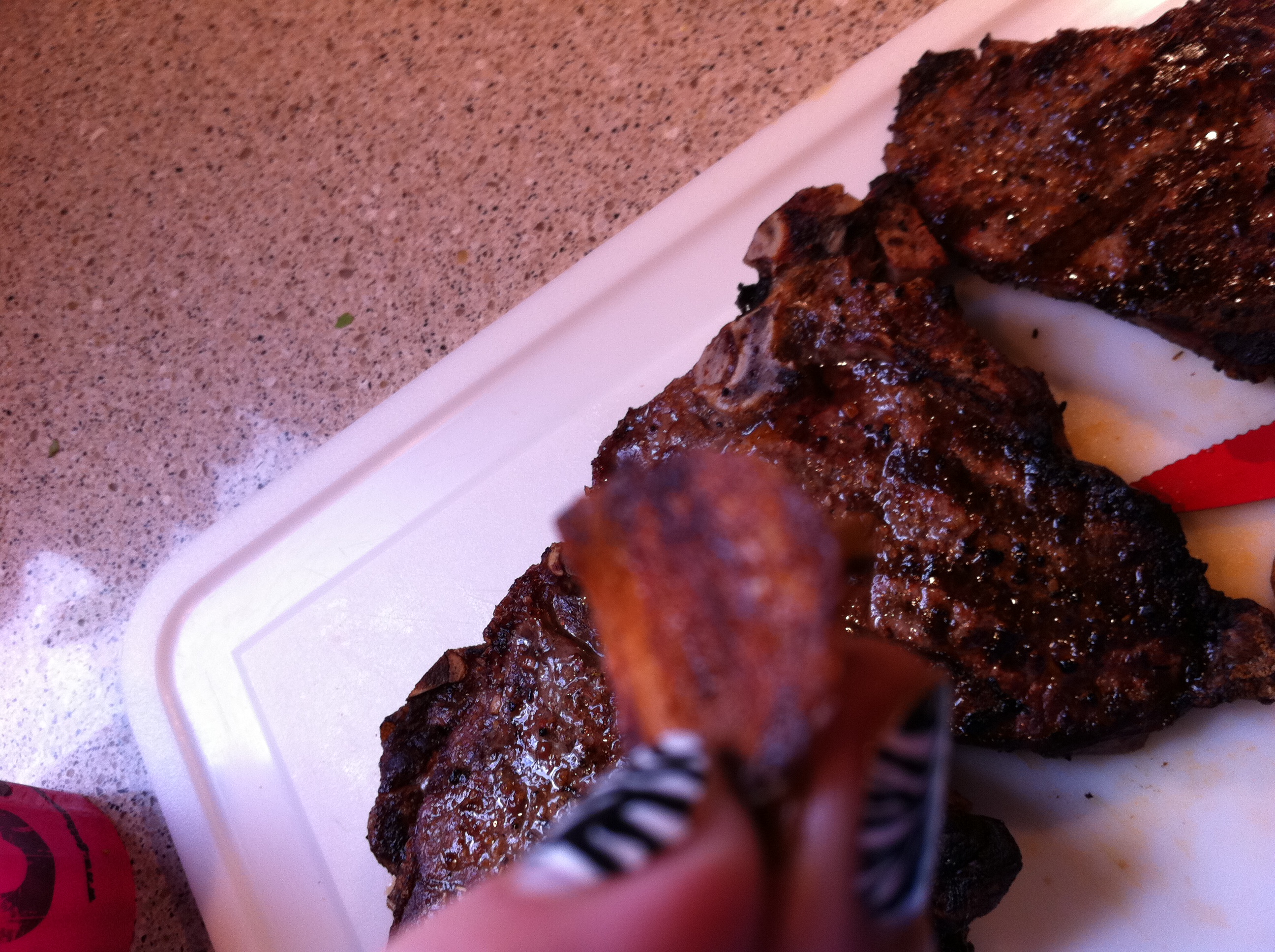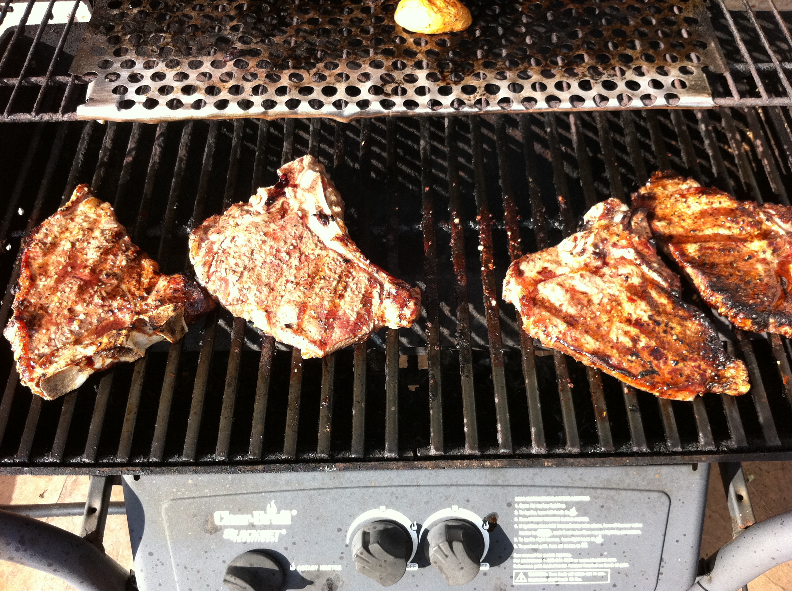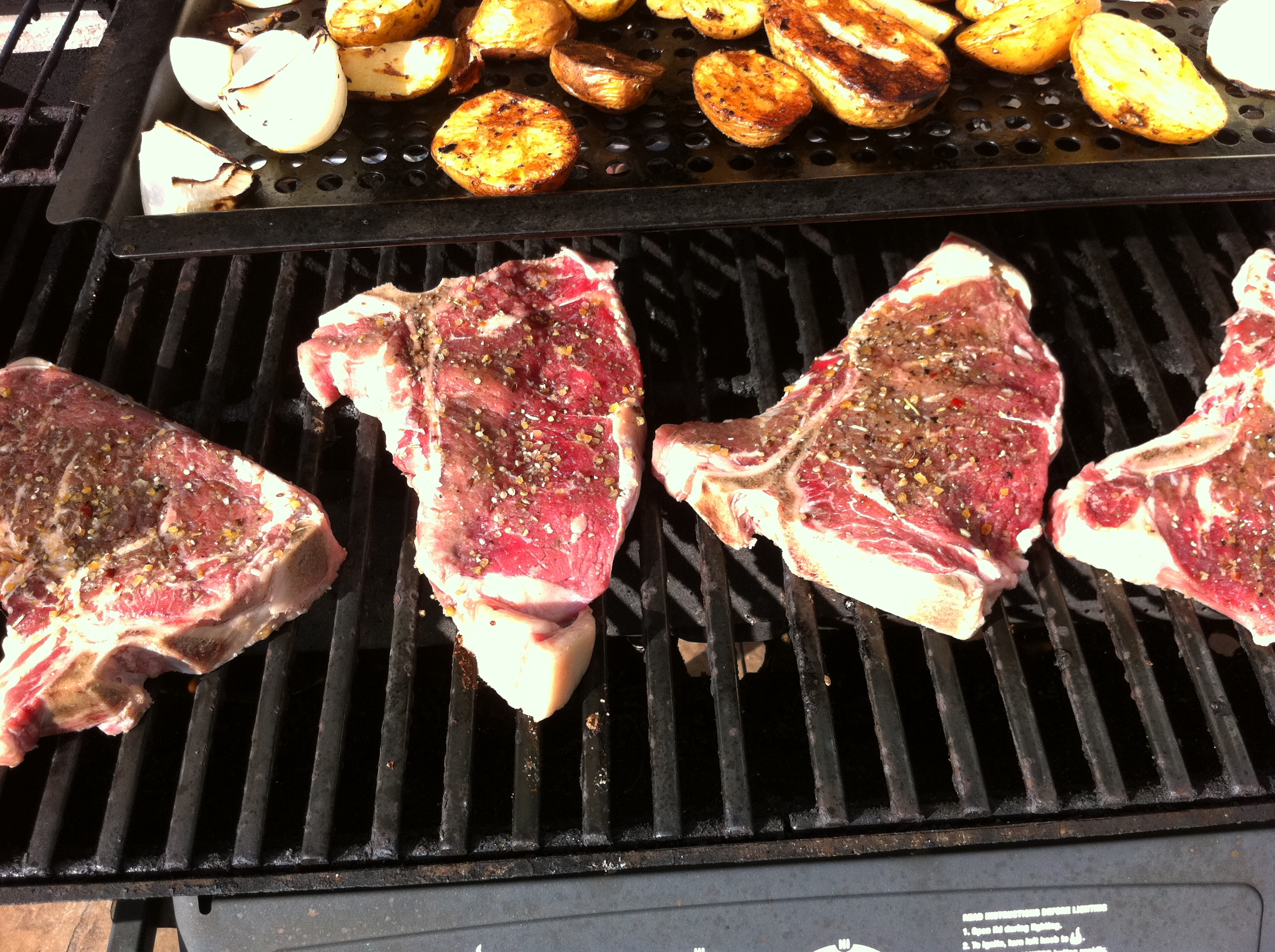 T-bones with Chicago Steak rub, marinated  with the rub on for a few hours, then grilled for about 8 minutes a side for medium well.