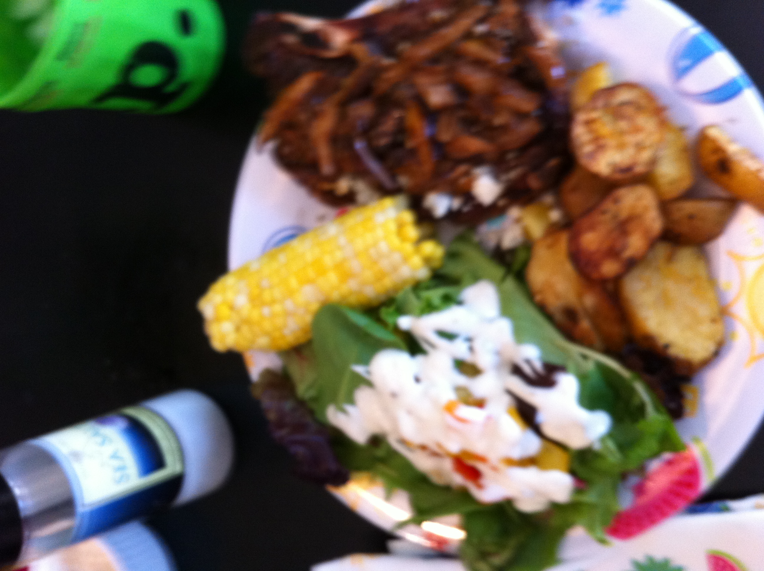 Locally grown corn and a salad with garden tomatoes and locally grown lettuce.  Thinking of the lettuce reminds me that I need to get my fall crop of spinach and lettuce in, though it’s probably way too late, never hurts to try right?