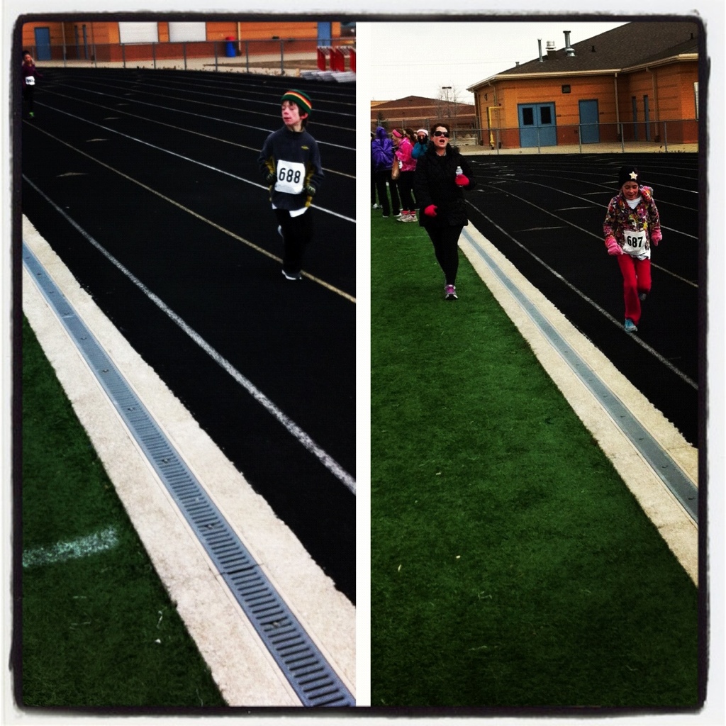 The 5K was probably smaller than 130 runners. I say this because I clocked a 34:03 according to the race results. Pretty darn respectable considering my 5K PR is a 33:43 I gained last year in the Mini training series when Babu set the first miles pace at something like 9:00. The Freedom Festival I finished under 40 minutes and I don’t even know what I did the Turkey Trot in without looking it up on Runkeeper and I am in a hurry to get this post done and too lazy to go do that. The point is I came in on the race results sheet listed as #103 …. out of #105. Now Babu and the kids came to the finish line to cheer me on as I entered the track for the one lap to finish, and he swears there were at least 4-5 people behind me. And we saw more coming in as we headed out to the track with the kids. I’m not too bummed about being listed as 103/105 because an 11:06 is not too darn shabby for me thank you very much. I have been sore and tight since Wednesday, just now coming down from the Girl Scout Cookie diet and it was seriously freezing and windy this morning. To be honest I was grateful I wasn’t doing the normal 45 minute Saturday run because I would have been required to put another mile on the 3.2 this morning and I really don’t know if I had it in me today.