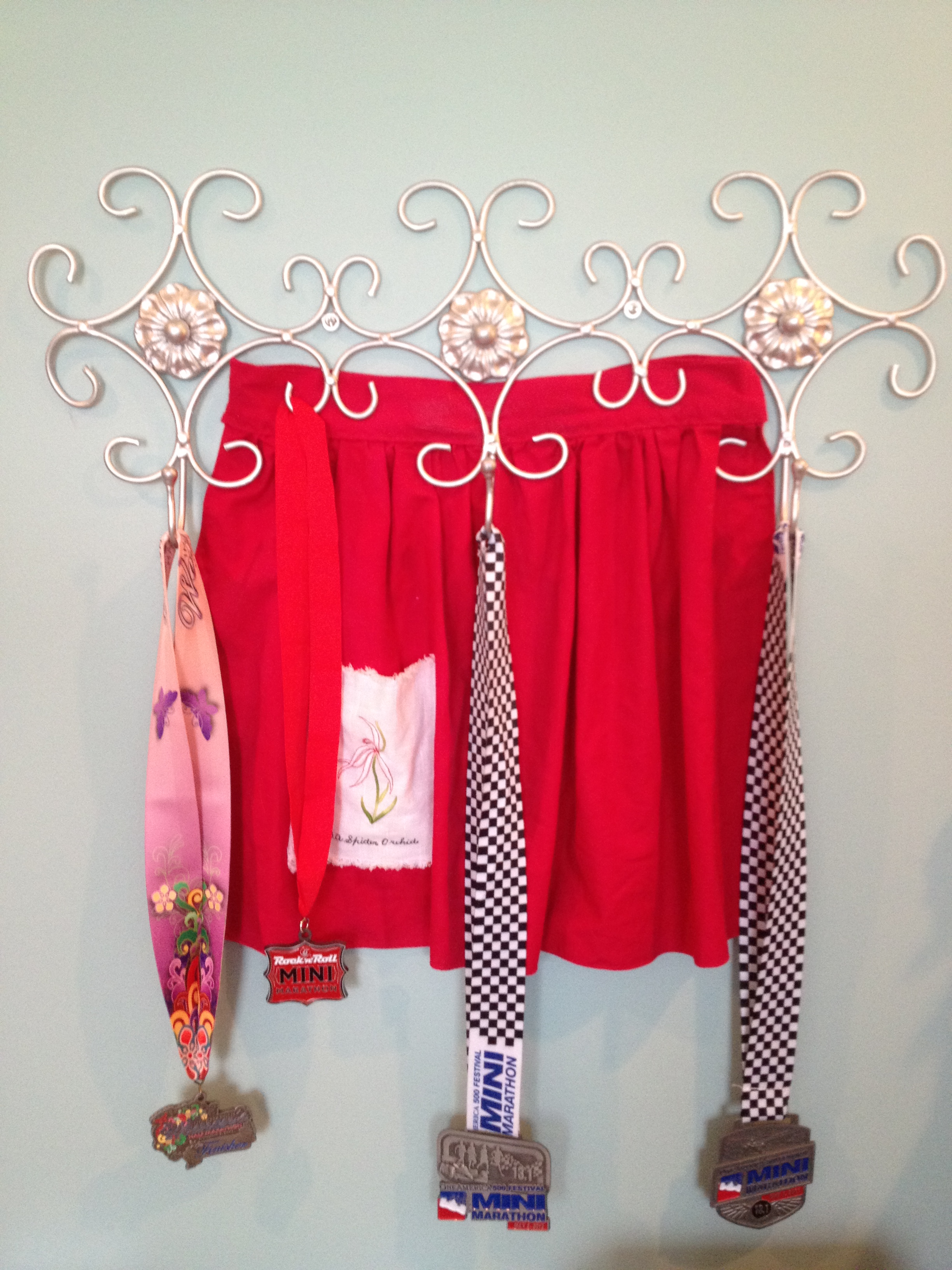 So imagine my glee when I discovered that there was a Mini (5K) and there was a medal for it! Here in Indy a Mini is 13.1, that is why I keep making the distinction, but I imagine you are clear now, so I will stop. I basically race for two reasons, to feel strong and proud of myself and for the bling. In the middle of 13.1 miles getting to the next water stop begins to be replaced by getting to the medal. I like shiny things, and I’ve started a medal hanger in my home office. Behind it sits an apron my mother embroidered. She was a stay at home mom and local piano teacher who also raised and showed Schipperkes. She married in the 50’s and lived in the housewife era and died in 1971 at the age of 40. I am the antithesis of housewife, I hang the apron there so my Mom can be a part of those medals, a little cheesy I know but it is also red and my home office color scheme is retro robin’s egg/tealish blue and red for the exact same reason, a nod to mom. But I am digressing.