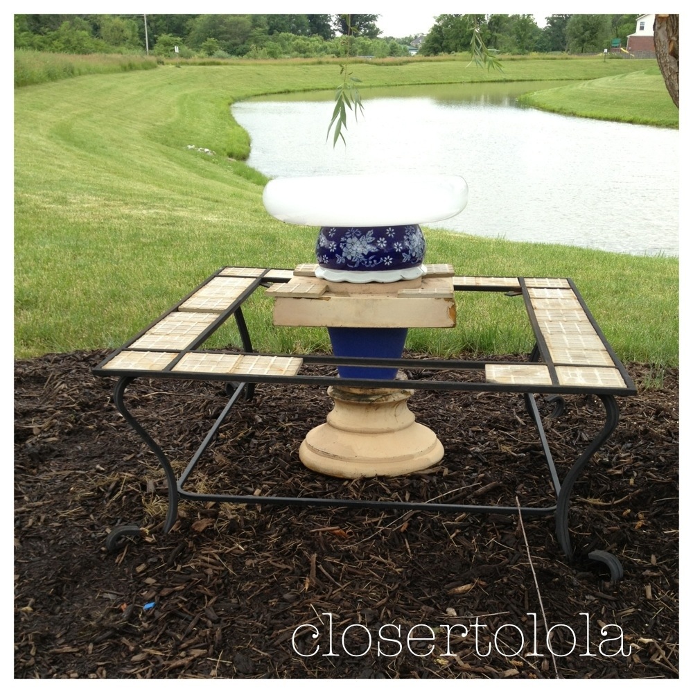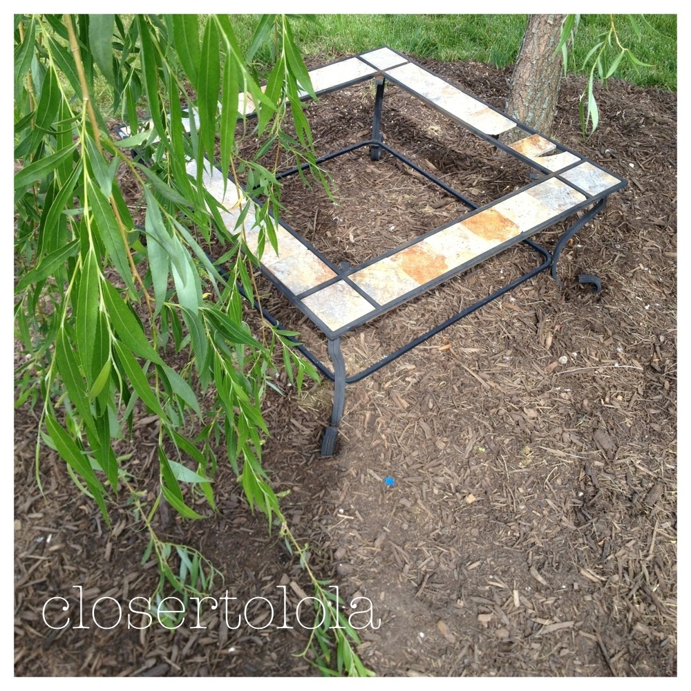Anyway, MiniBoobs and I spent this week bantering back and forth on how to repurpose the firepit frame and tiles into the garden. I got the idea for a bird bath under my willows. Then set about how to make my vision come true for as little money, time and effort as possible. But it still has to look amazing to my standards and it has to also feel right.