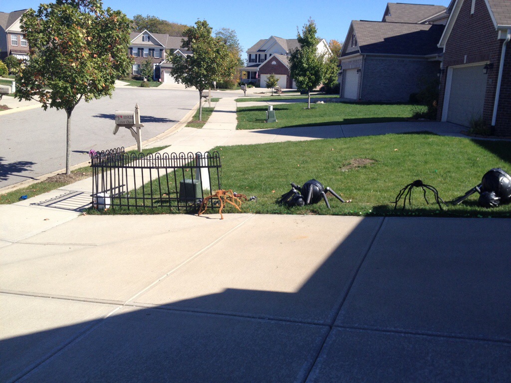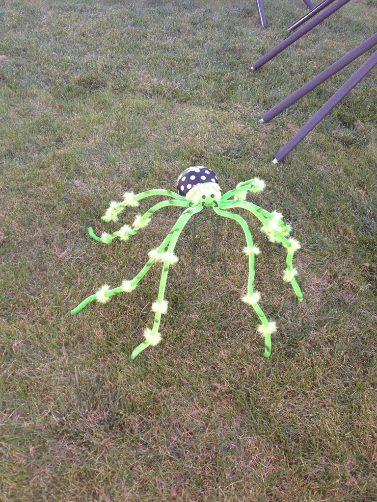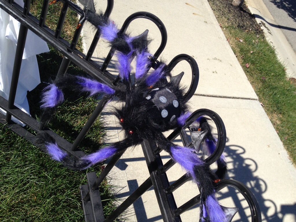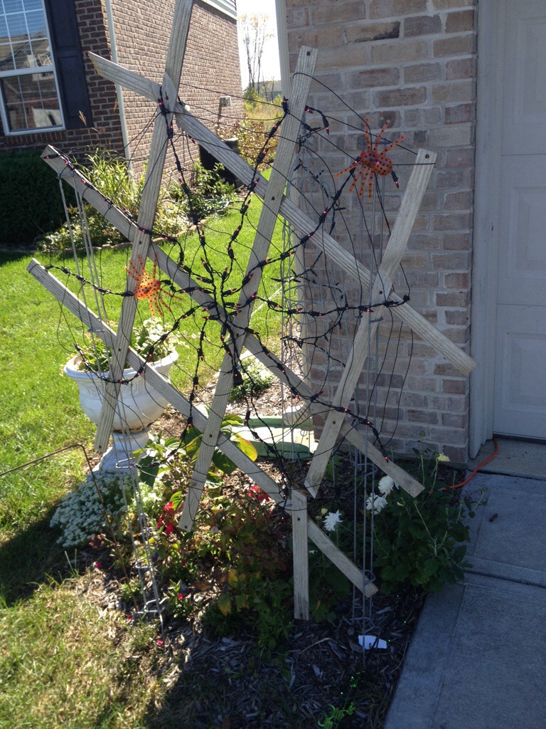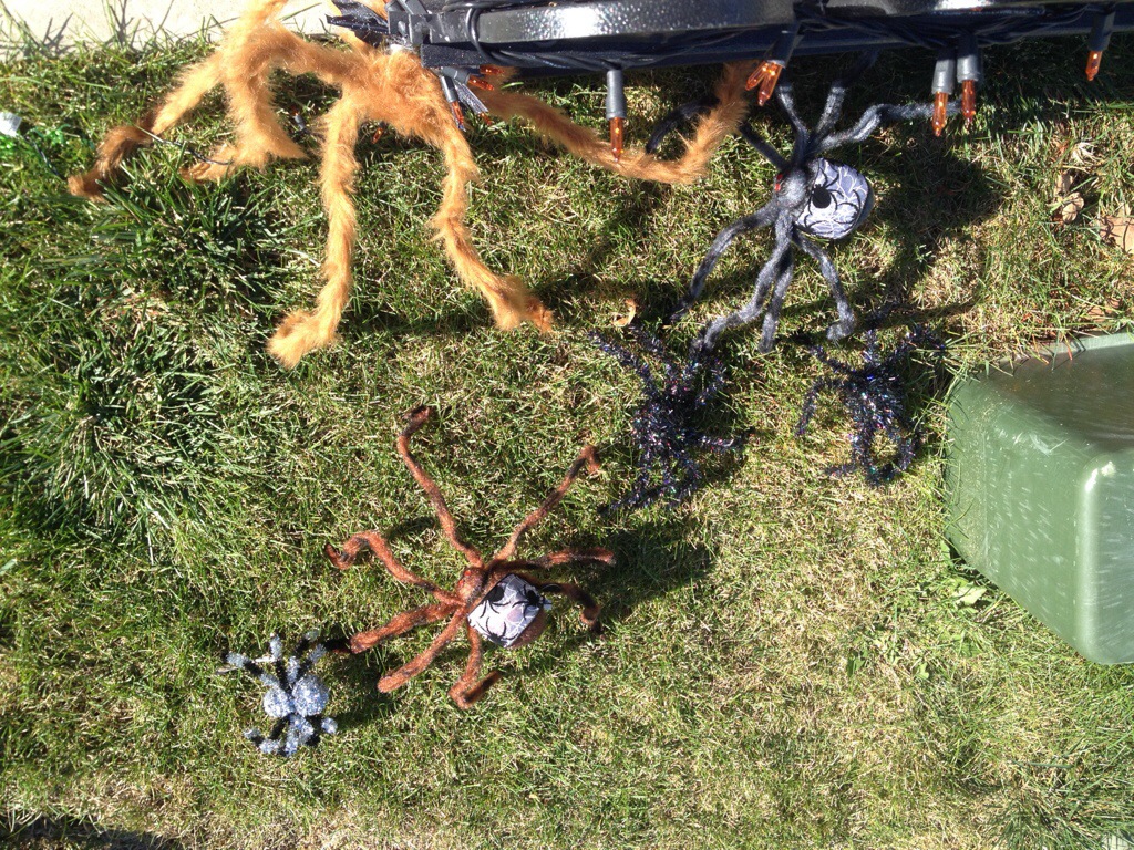 Posted: 2013/10/14 | Author: Lola | Filed under: Decorating | Tags: DIY Ghosts, diy halloween fence, Halloween Yard Decor, pvc pipe spiders |Leave a commentWe did a sort of cross country racing spiders with ghosts watching this year. The ribbons are supposed to denote teams and give the display some shine and depth during the day. I’m super happy with the white pumpkins and spiders under Fetch. Not so pleased with the wood spider parts sticking out of the other white pumpkin. Something may have to be done with that corner. We have lights for a start and finish line and displays on both sides of the driveway this year. I also used tomatoe cage say stakes to hold up slightly diagonal old still screwed together raised garden bed diver boards. They made cool web light back drops and look old and rustic because they need to be torn apart and thrown away. Yeah repurposing. I also used garden flower stakes to hold up some of the taller fuzzy spiders and to keep them anchored to the ground and in less danger of blowing away. Inside is done minus one banner and putting it all alway. More posts and pics to come