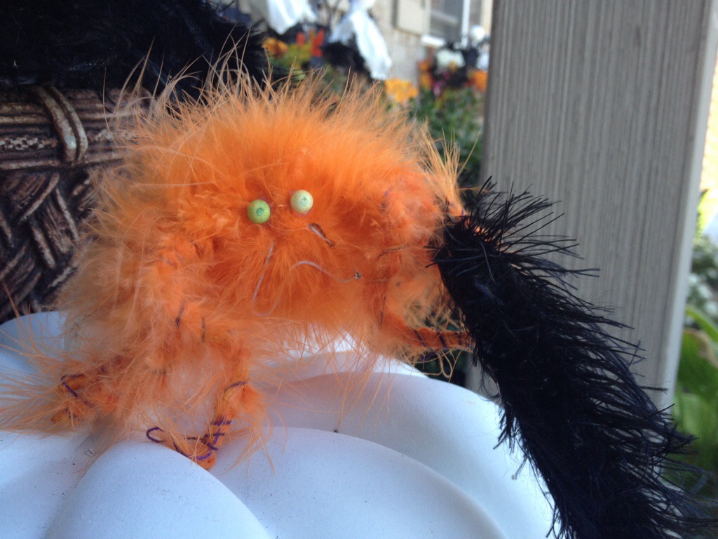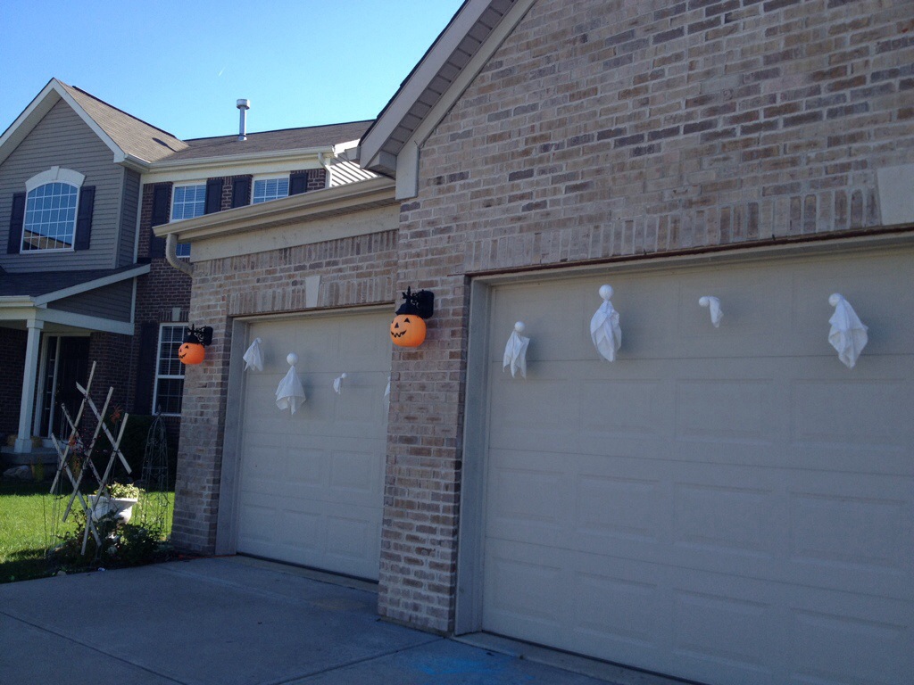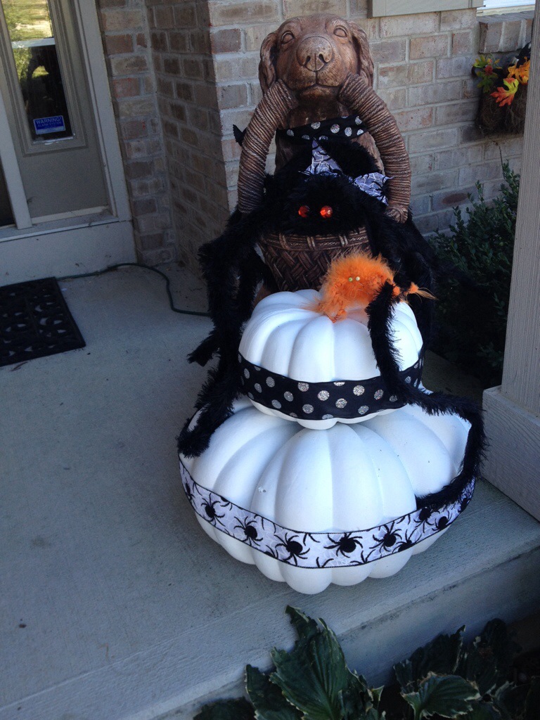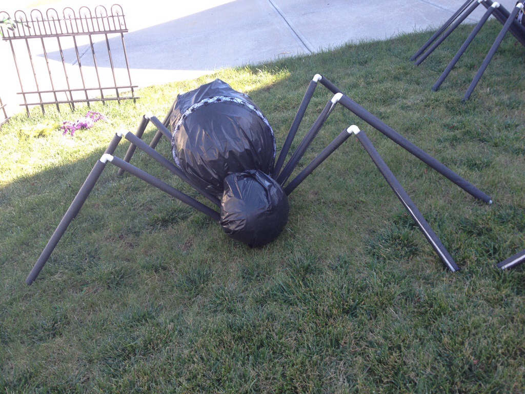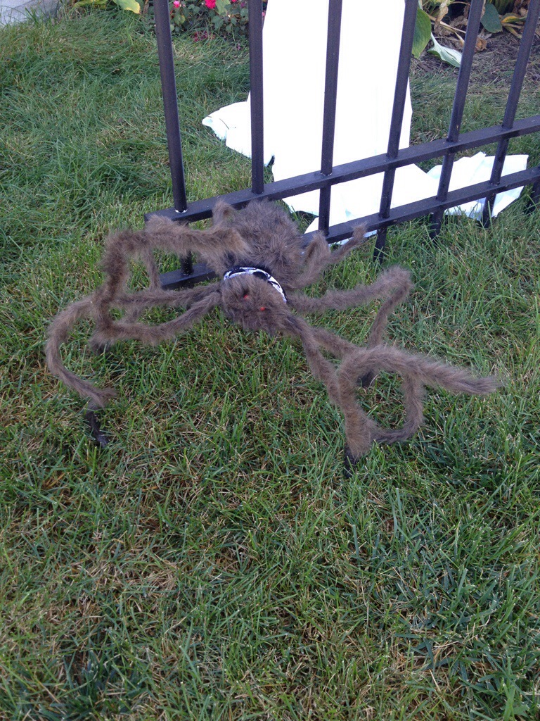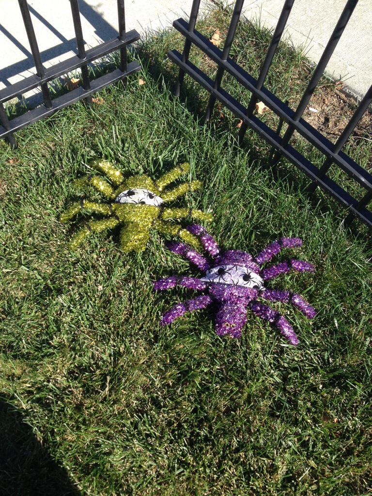 Posted: 2013/10/14 | Author: Lola | Filed under: Decorating | Tags: DIY Ghosts, diy halloween fence, Halloween Yard Decor, pvc pipe spiders |Leave a commentWe did a sort of cross country racing spiders with ghosts watching this year. The ribbons are supposed to denote teams and give the display some shine and depth during the day. I’m super happy with the white pumpkins and spiders under Fetch. Not so pleased with the wood spider parts sticking out of the other white pumpkin. Something may have to be done with that corner. We have lights for a start and finish line and displays on both sides of the driveway this year. I also used tomatoe cage say stakes to hold up slightly diagonal old still screwed together raised garden bed diver boards. They made cool web light back drops and look old and rustic because they need to be torn apart and thrown away. Yeah repurposing. I also used garden flower stakes to hold up some of the taller fuzzy spiders and to keep them anchored to the ground and in less danger of blowing away. Inside is done minus one banner and putting it all alway. More posts and pics to come