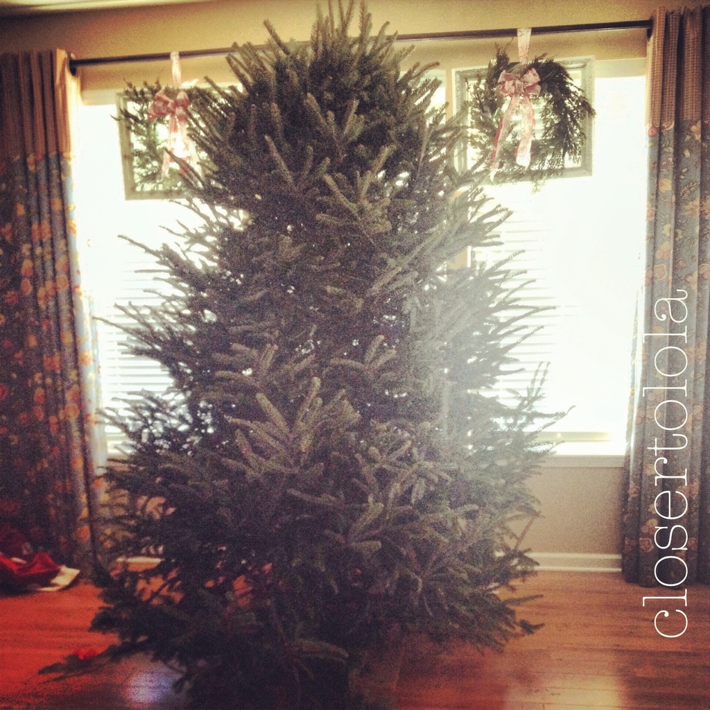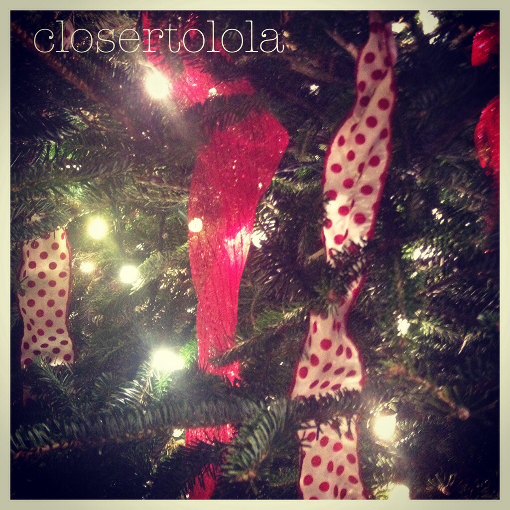 Posted: 2013/12/02 | Author: Lola | Filed under: Decorating | Tags: Christmas Decorating, deco mesh in a christmas tree, ribbon on tree |Leave a commentEvery year we get a live tree. The biggest fattest tree we can find. Every year The Destroyer names the tree. This year he named her Martha, our first “girl” tree. In spite of scaling back the progress has been slow this year. Iv’e got more done than this but here is the tree progress so far. I figured out the deco mesh looks best when pushed back into the tree and not swooped or puffed in any way. How are your holiday decorations coming?