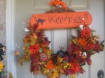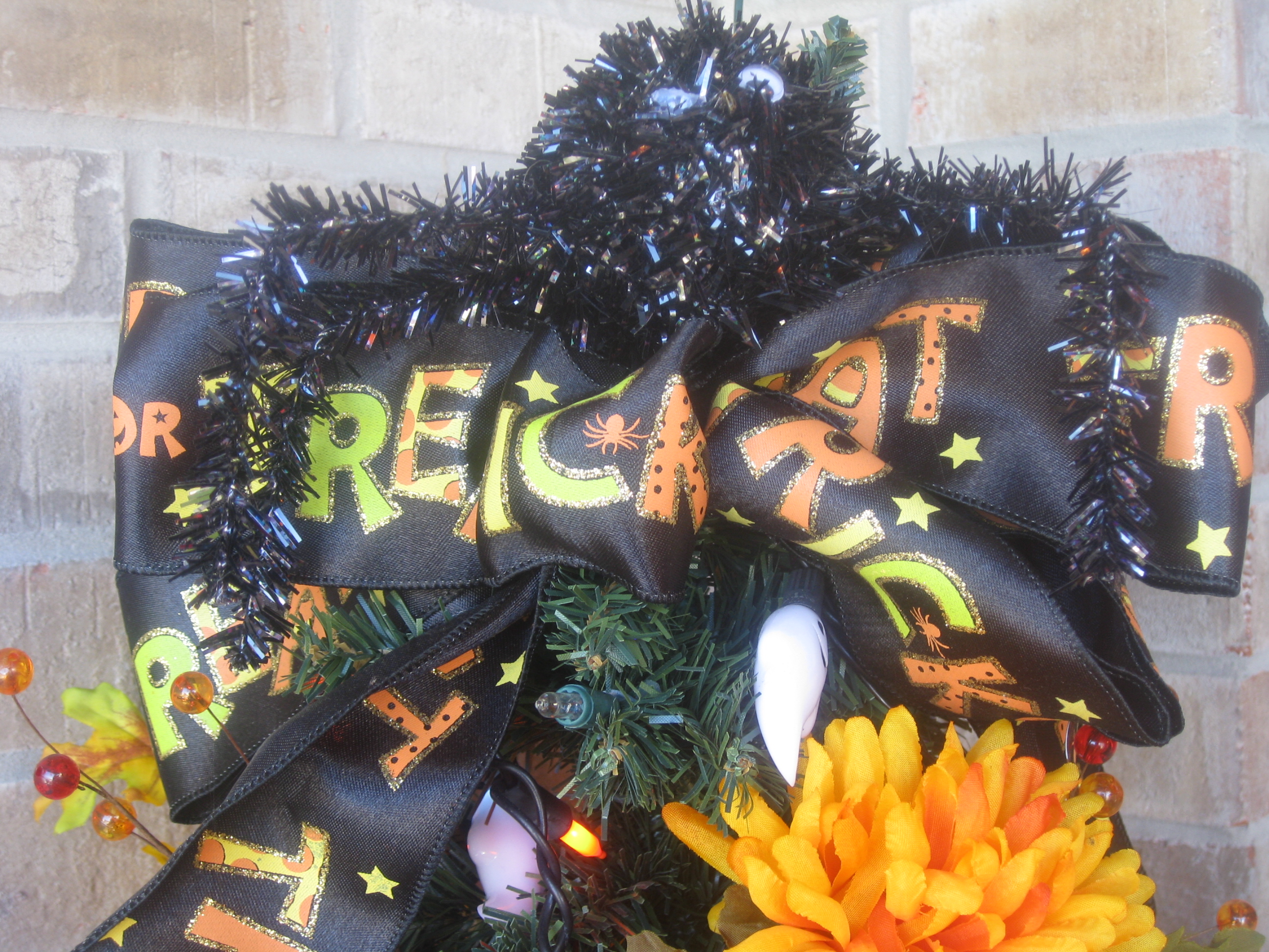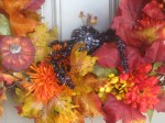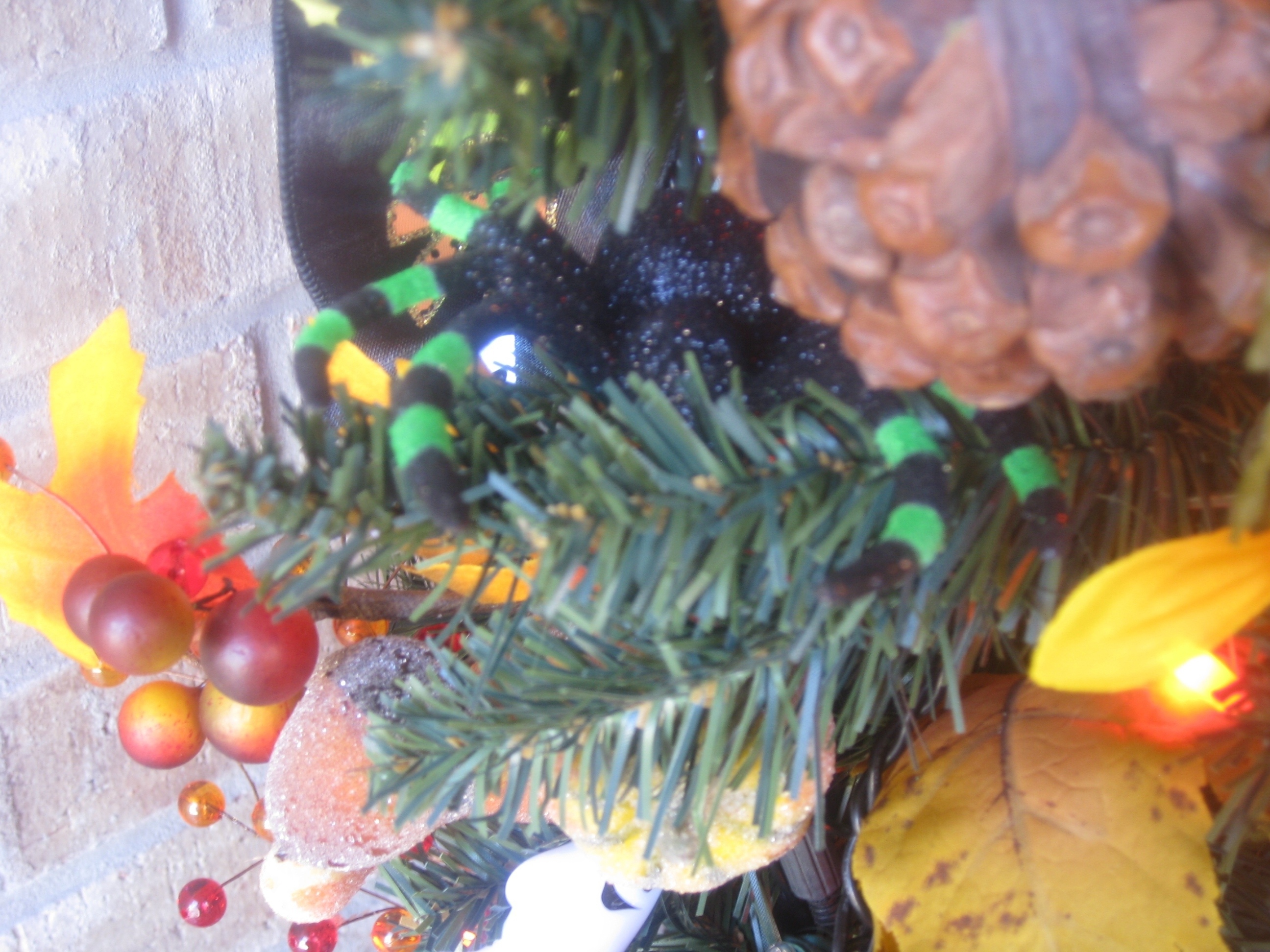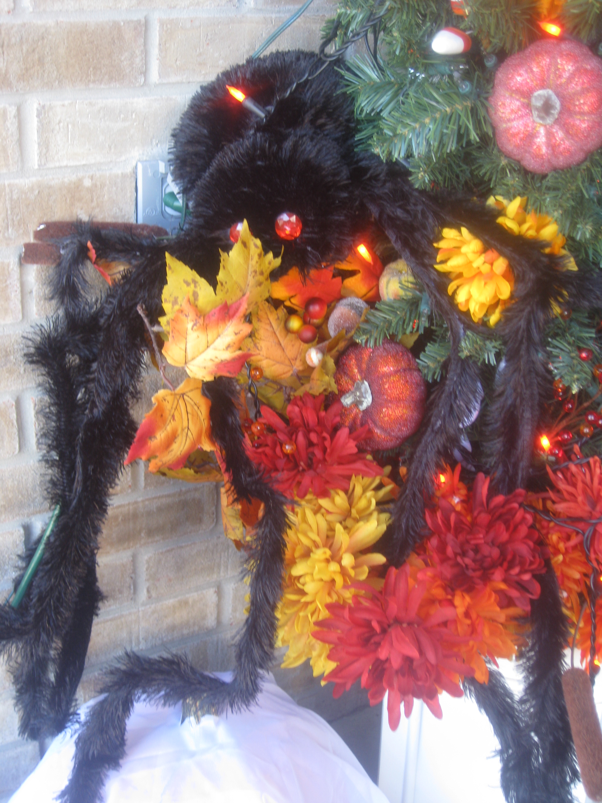Oh, the Fall tree was also mine. I’d seen them in the craft stores and had one inside last year. This year I skipped that and drug the outdoor Xmas lighted porch tree outside early. It is shoved full of some of the same fall flower picks and pumpkins that I had in my stash. then I added the orange little lights and white ghost lights. I also put in a few spiders and a Halloween ribbon on the top. On November 1, I will pull all the Halloween off and put in the Thanksgiving fall stuff. Same concept with the grape vine wreath. I never glue anything to my grape vine wreaths because that way I can change them out as often as I like for less money and less storage.