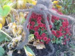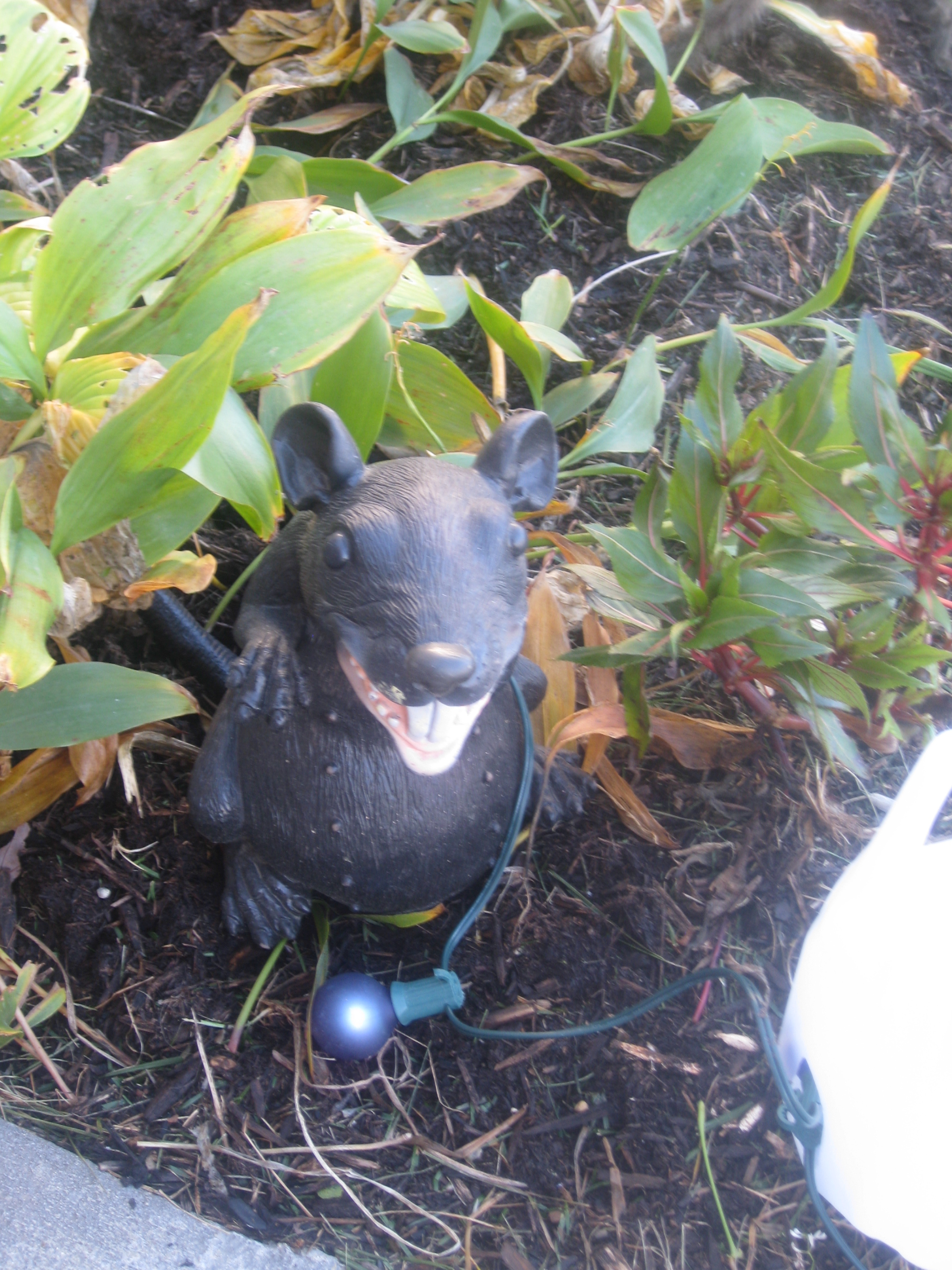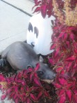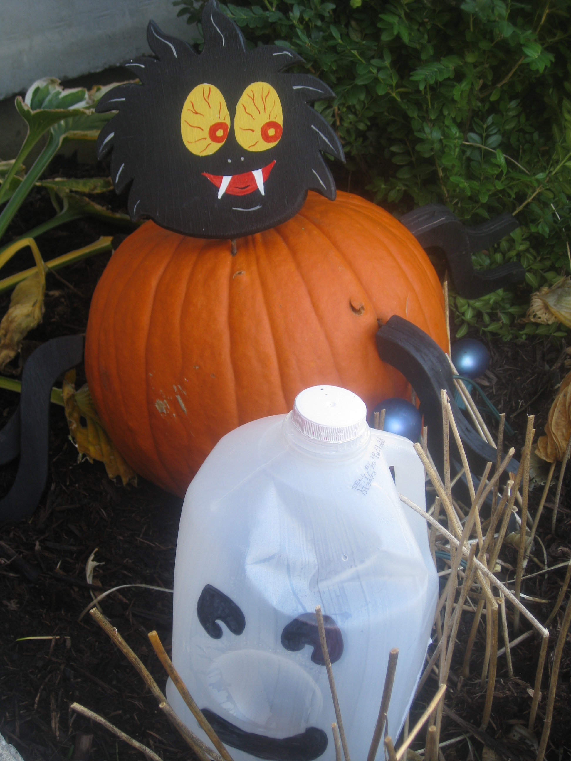 The bigger ghosts are 4′ shim boards we used for the grid lines for the Square Foot garden. cut one end on an angle. The heads are those plastic store trick or treat pumpkins, Dremel out a notch in the bottom so they slide tightly onto the top of the stick. Cut off the plastic handles and then pound the whole thing in the ground with a rubber mallet. We tried lighting them from the inside of the heads this year with battery operated pumpkin lights, but it isn’t working so great. Next year I will try battery operated light up X-mas lights.