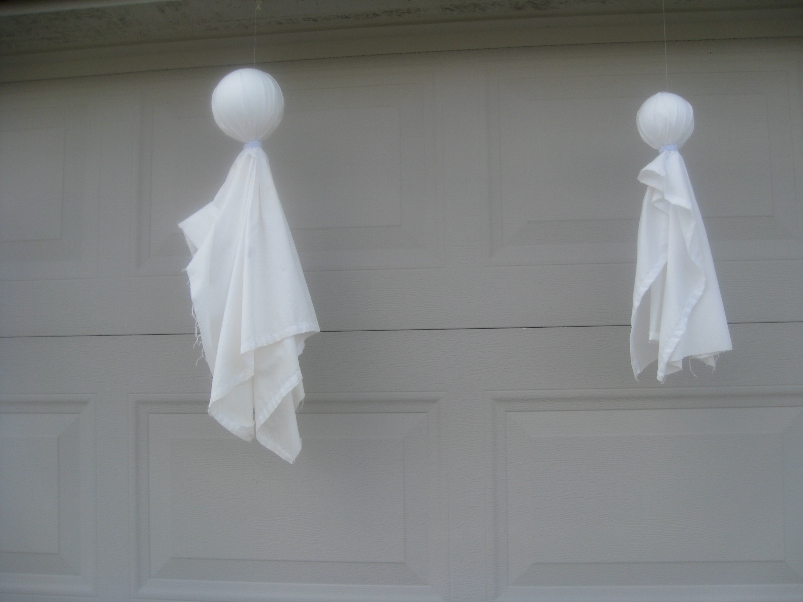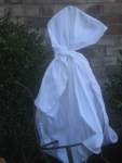 Now the sheets on the kid ghosts are all from Goodwill. In order to get the best results you really full size or larger. But I also scored a white tablecloth and a white shower curtain and I cut those worked just fine. Don’t shy away from mostly white sheets with a trim of something. I found two like that and just cut off the patterned trim edge. Also I had several sheets that were fitted, rather than flat. I needed a lot of white sheets and I made a round trip to 4 Goodwills to get white sheets. I cleaned all of them out of everything they had that might work because I didn’t know how lucky I would be at the next one. So I had probably 3 fitted sheets with the elastic edges. I cut the elastic off all around each of the fitted sheets. Guess what?! This gave me white elastic long and sturdy tying material for the necks of each ghost when I went to tie up the sheets to the heads. So if you are going to try this don’t shy away from those fitted sheets!