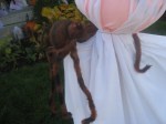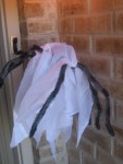 The little hanging ghosts are made of cut up sheets, styrofoam balls in various sizes, 2″,3″ and 4″ from the craft store and white pipe cleaners. Hang with filament or fishing line and for the bigger headed ones it helps to put a thumb tack or eye hook or screw tack if you can find them into the top of the head . Wrap the filament from the neck to the tack ont he top of the head and them those should hang a little straighter. I made these a few years ago, but I think I cut pretty large squares from 1-2 king flat sheets I bought at Target. They have held up really well and the edges now have a sort of frayed worn look which I think is pretty cool. Just this year we are finding that the filament needs to be changed or added to most of them. Now my savvy decorating neighbor who I totally stole this idea from also made ground ghosts. I don’t know for sure how she did it, but I imagine it could be done with the exact same materials plus a cut up small round dowel rod shoved and hot glued into the base of the Styrofoam ball head, like a little ghost lollipop. Hmmm, that gives me an idea for next year. We are pretty stuck to doing ghosts and spiders each year because I’m saving all of this stuff in my huge basement that’s never likely to get finished before my kids can enjoy it anyway. Of course, if we wait then I can claim it as Lola’s Boom Boom Room and make a long bench throne for the bad girls and I to sit on. I digress.