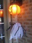The ghost pumpkins are just regular jack o lanterns, carved with ghost faces and covered in a cut up sheer curtain panel from Goodwill. This is the only craft I designed myself. Everything else I stole from a decor savvy neighbor years ago or looked up online and put in Pinterest to try out this year. Left over sheer window panel made a great ghost costume for Edwin the spider. Who is hanging from the porch light and ringing the doorbell.