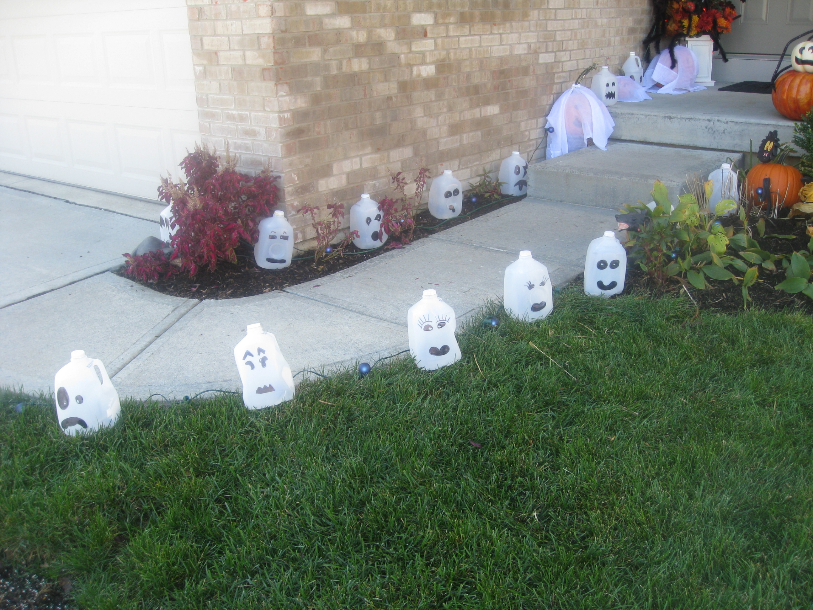Anyway you need to rinse them out well. And just use a small exacto craft knife to cut a round hole near the back bottom edge . Then use a big smelly sharpie to get high, I mean draw cute/scary/KISS ghost faces on the front of the jugs. The whole family can help with this as you can see from our jugs. Hmm, just got another idea for next year. You could draw anything on the jugs and use this idea. Words, spiders, anything!!!! So it makes it a cute idea for more than just Halloween. I am rarely smart enough to come up with these kinds of realizations on my own, and you just got to witness one.