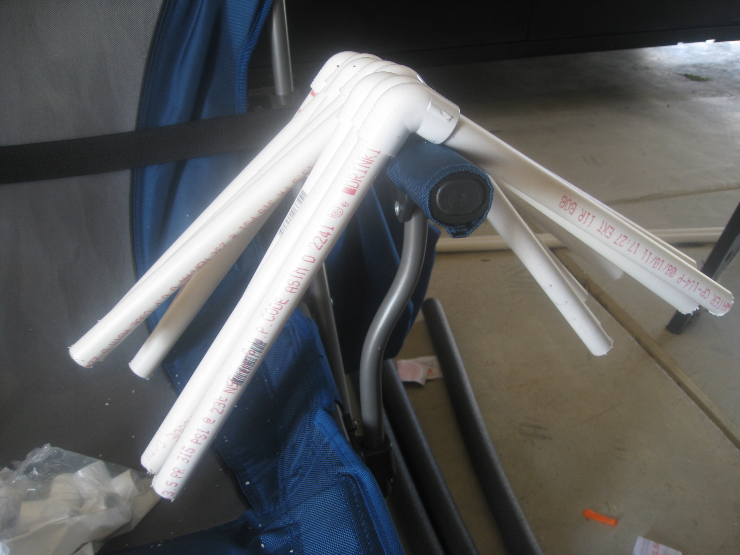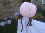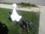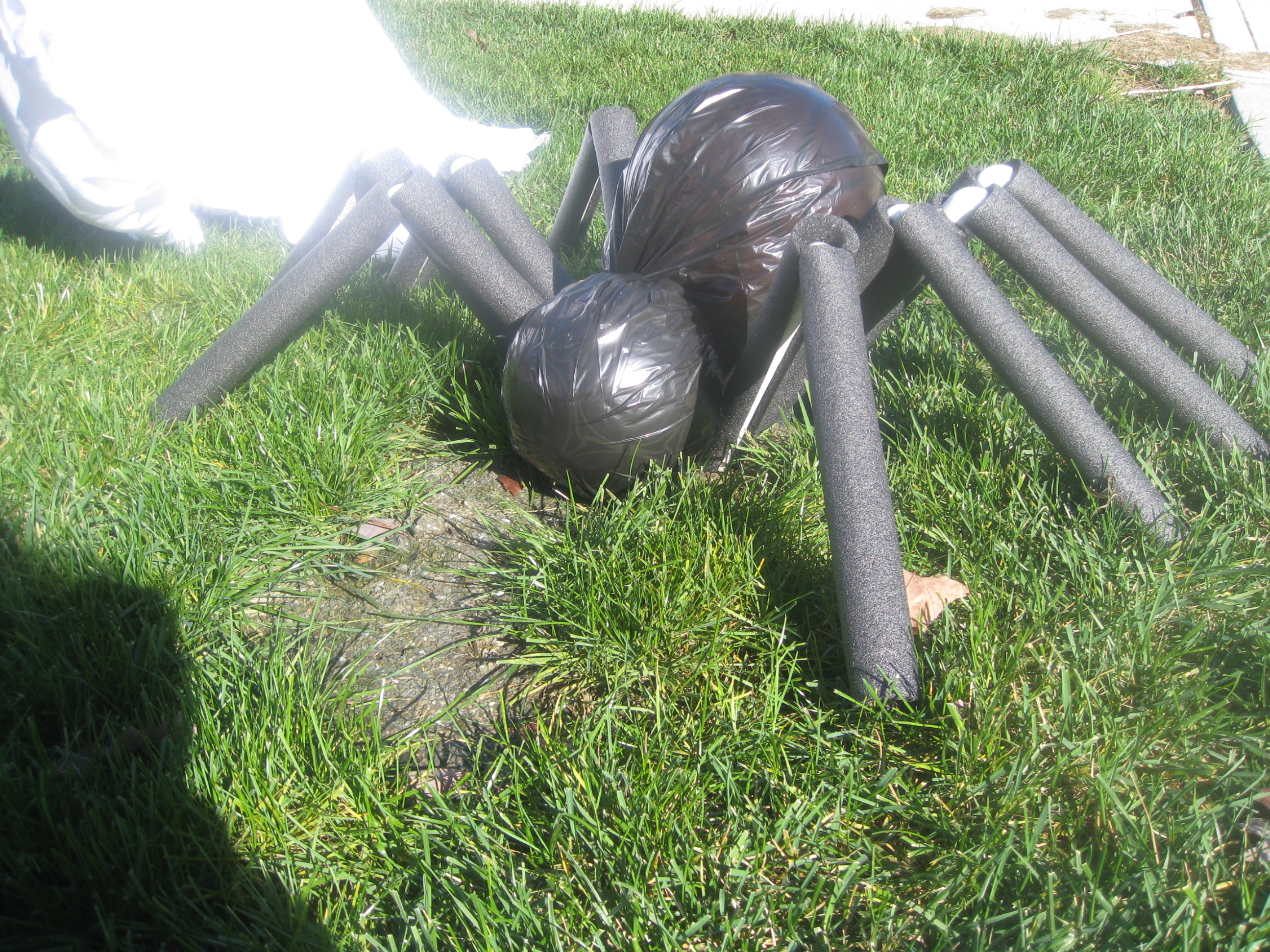 The big spiders are made from random balls around the house wrapped in either trash bags or landscaping fabric or both. Ours are anchored with spray painted black wood blocks to give them stability and also raise them up a bit all over or just in back. The legs are nothing more than 1″ PVC pipe, cut with a hacksaw very easily into legs. Then joined together with PVC joints. and covered in cut black pipe insulation. We left the knees white but if it bugged you one could spray them black as well. Then we cut those long tall bamboo or thin metal covered in green plastic poles for the garden into long spikes. For the 1’x1′ legs I cut them about 12″ or so long, so one 8′ pole in my garage made 8 spikes for anchoring the legs. For the 3’x’3′ legs we cut them about 18″ or so long. Then drive the spikes into the ground at a sever low angle to the ground very near the spider body. Slide the pvc legs onto the spike and repeat until you have all 8 legs on the ground.