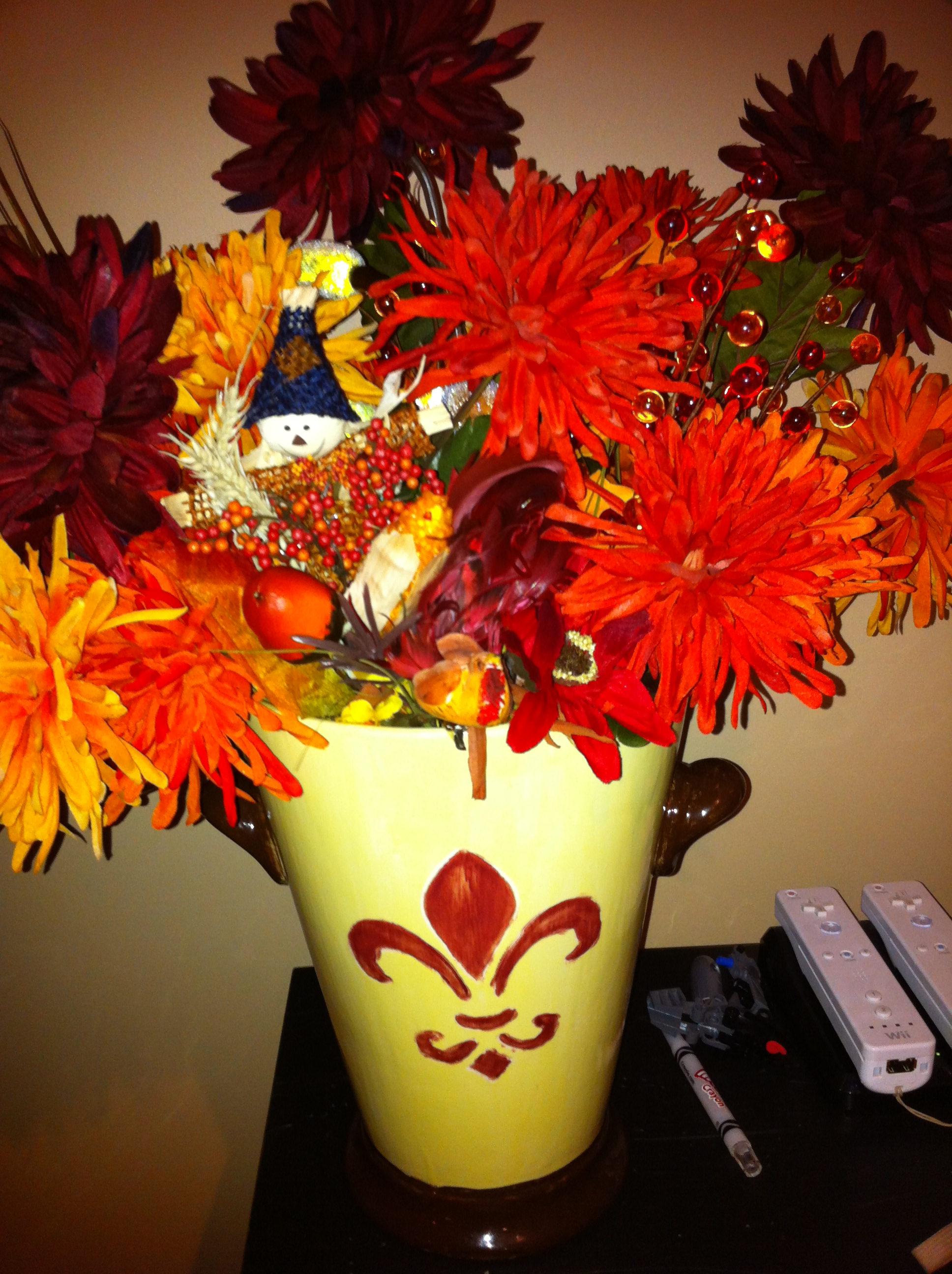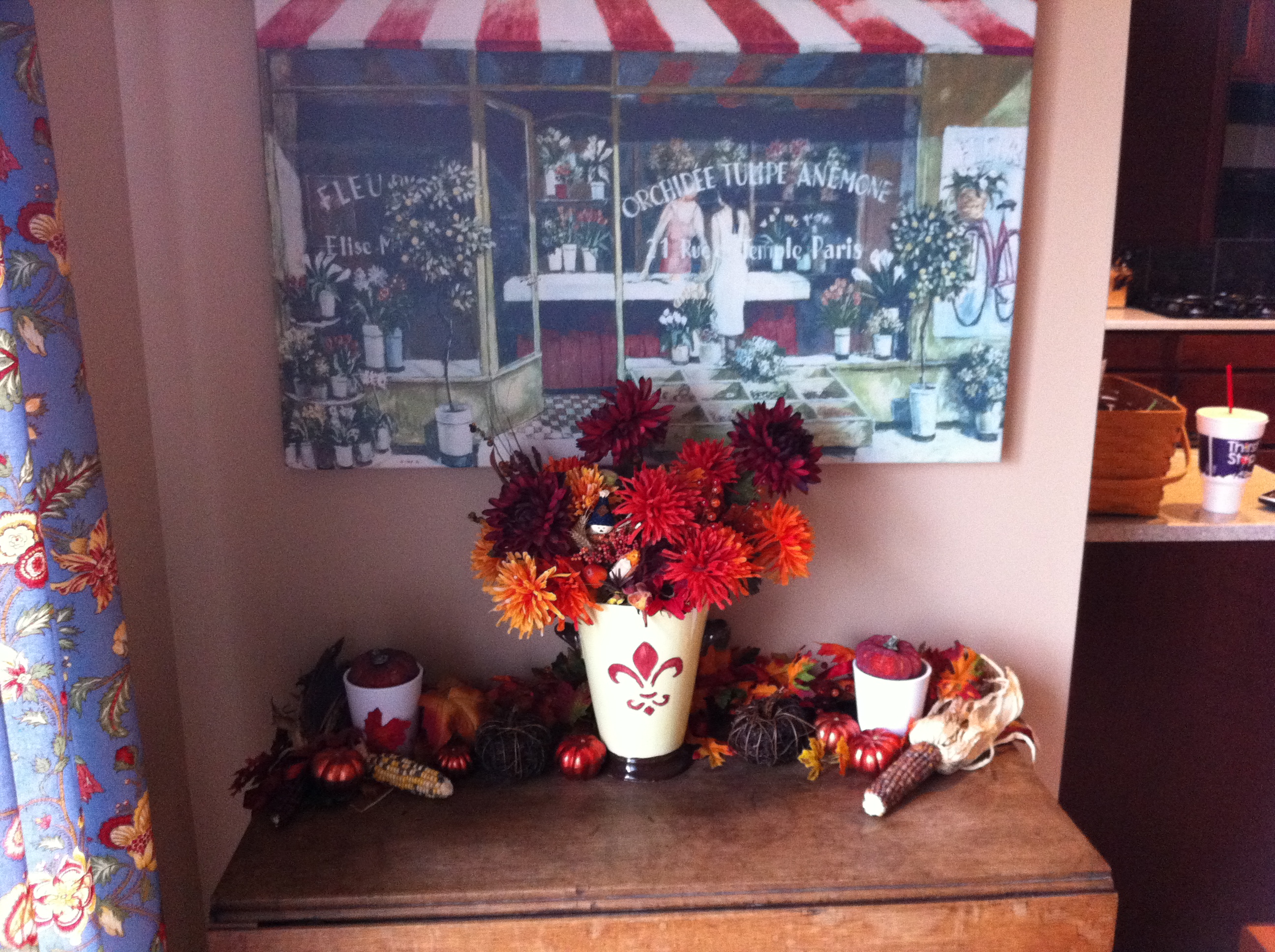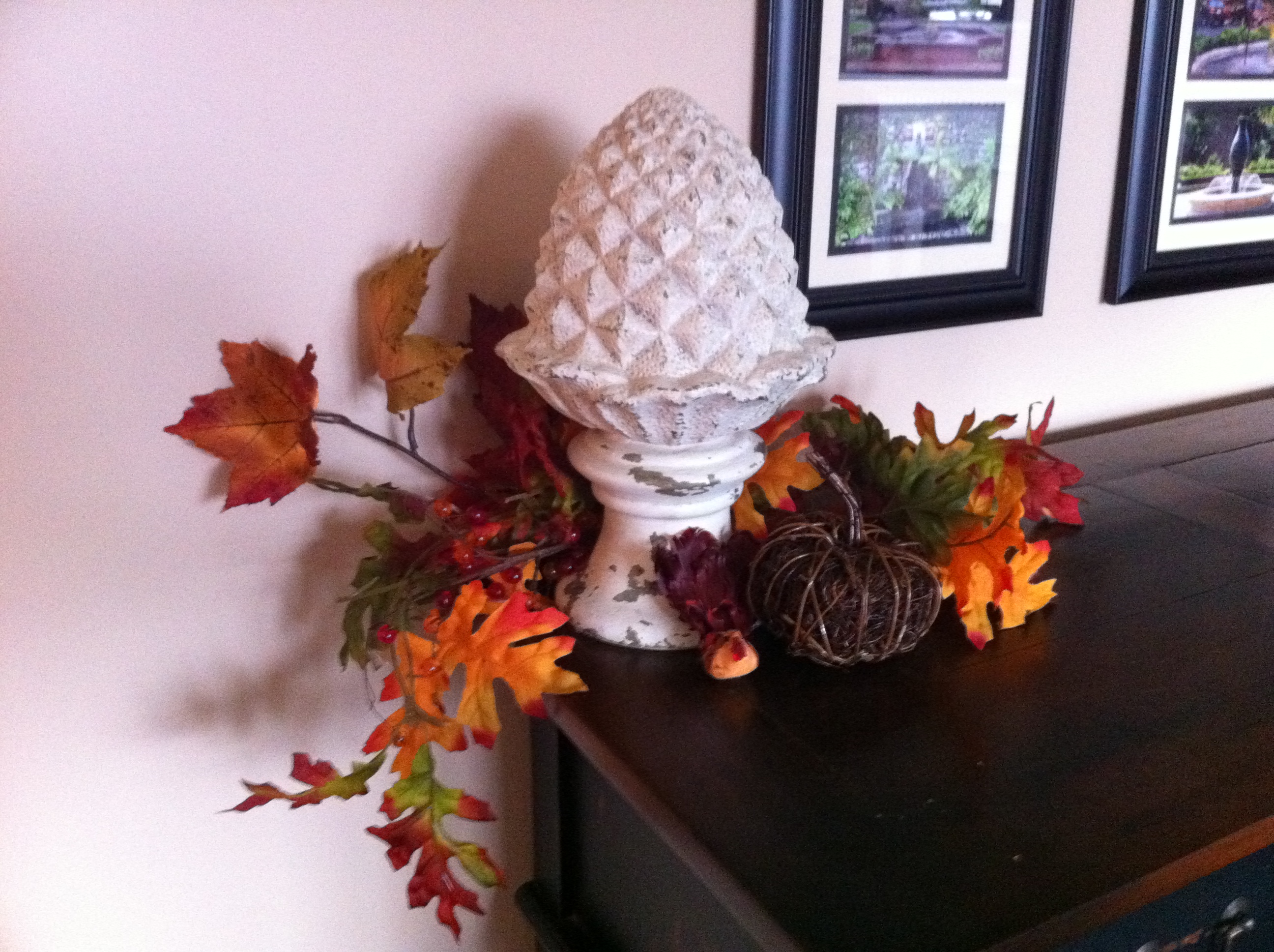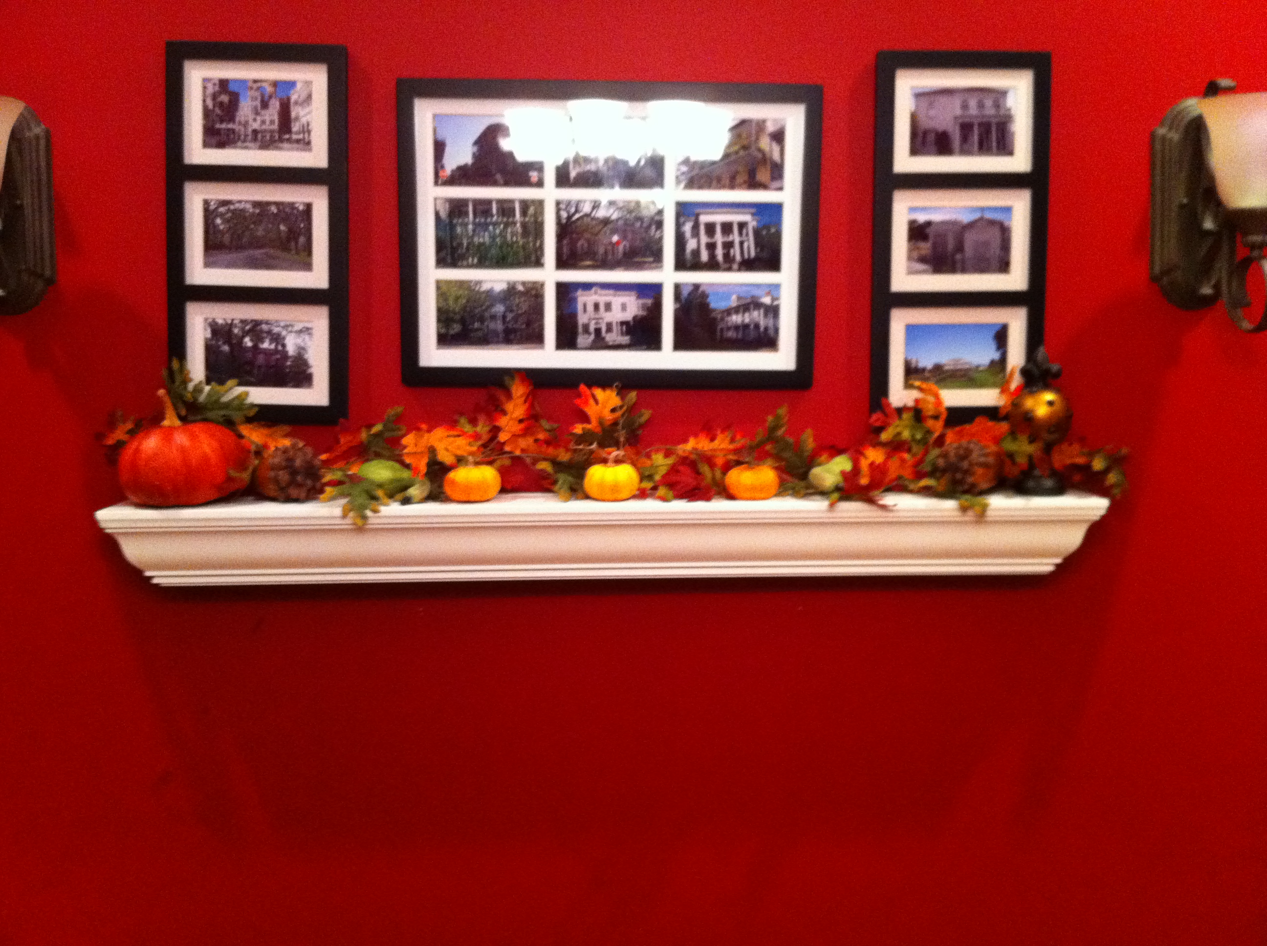 Posted: 2011/11/14 | Author: Lola | Filed under: Decorating | Tags: Decorating, holiday decor, Holiday Decorating, Interior design, Thanksgiving | Leave a commentWe won the neighborhood Halloween Decorating Contest for Best Overall Yard. It netted a $100 Gift card that we can use to dine at a cool restaurant in the arts district downtown. I hurried and got all of the indoor decor down and put away before The Ladies came to clean. They aren’t doing so hot, we are on crew number 2. In the past I would of also made the transition to Thanksgiving decor at the same time. This year I enjoyed the clean empty spaces on all my surfaces for a little bit before I dug back in. I am even thinking I’m not putting out Dept 56 Christmas Houses this year. But we will see how I feel once Thanksgiving gets here. It’s the first Thanksgiving in a while I can eat when I want, where I want and we are eating at 6 at my house. I’m buying The Husband a new fabulous electric smoker for his coming Birthday, and he is making a turkey breast and something beefier. The rest we will work out later, but I did promise homemade croutons and spinach salad. It’s nothing super special, but I’m sharing mostly because I like looking at what other people do and getting ideas.