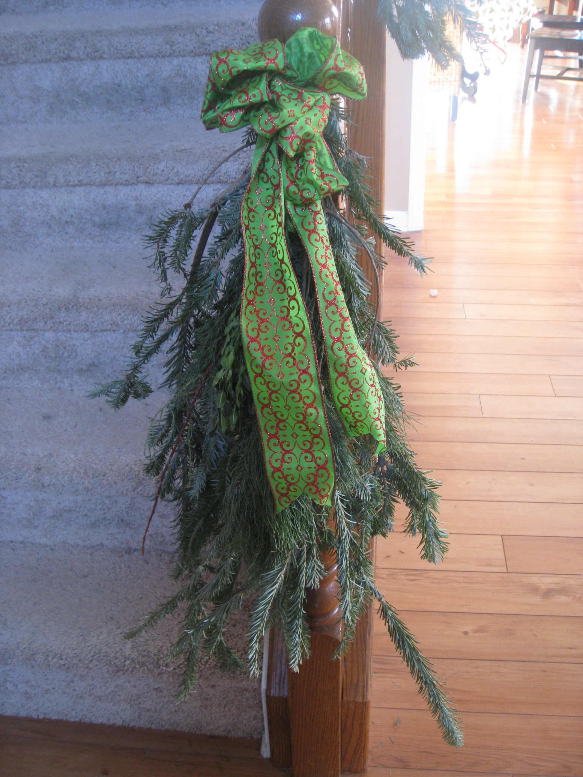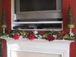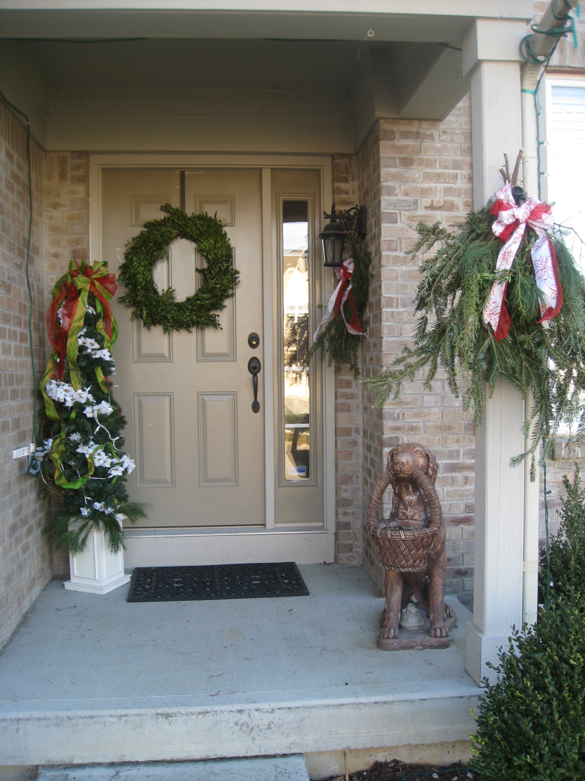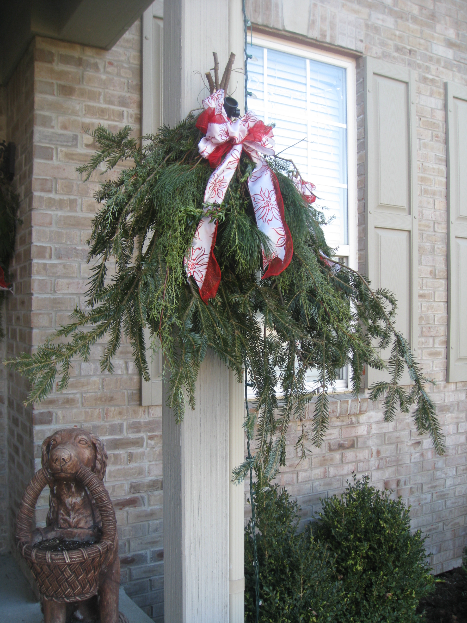 Posted: 2011/12/12 | Author: Lola | Filed under: Decorating | Tags: Christmas, Decorating, DIY Swags, holiday decor, Holiday Decorating, swags, Tree | Leave a commentHappy Monday Lovies. Somehow I found the time and most of the energy to run around and take some pics of the Holiday Decor I put up this year. I usually have 2 indoor trees, but after doing all of the swags I ran out of time and energy and decided to let the smaller artificial tree go for this year. We get a real tree every year and place it in a rather large open corner of our living room. We have 9 foot ceilings and it has to be wide enough to fill the space without looking puny. This one isn’t nearly as big as some of the trees of Christmas past, but at least it didn’t fall on top of me while I was trying to move it and require my daughter to go ring the neighbors doorbell so he could come rescue me like a few years ago. I found the ribbon at Sam’s Club and you may not be able to tell but all of the red on both kinds is actually glitter. When I was done putting the tables and mantels together it looked like Santa’s Glitter Den up in here, and all over my face. Totally worth it because it looks far better than it photographs. I had Mini Boobs make all the bows as she is my go-to bow maker and she works really cheap! The swags are a mix of 4-5 different kinds of greenery I bought fresh in bunches at the local nursery where we get our tree every year and the backdrop for them is the bottom cuts from the actual tree itself. I used a set of pruning shears and a lopper for the larger branches. It takes awhile to match them all up kind of evenly and then work in the other top layers, but it looks really nice for not a lot of money. I also got the loading guys to allow me to take a whole pile of tree pieces from the other trees that had been cut before the greenery girls came over and turned them into swags they sell there for at least $10 each. And those aren’t for anything layered like mine. The wreath on the door is boxwood and matches our front bushes. I used plastic garland ties to hold the swags together and when I ran out of those I used green garden tie tape that easily rips and has a little stretch to it. Just start with your biggest branches of greenery and then work in your others in layers to position as you like before tightening. Take the screens out of your windows and hang with big suction cups. They should stay up all season long. I chose white ribbon for the outside of the house because white shows up really well in shade and dark. We have led lights along the house to in bright white but I didn’t get a pic of those. For the tables and mantels I mixed in my silk garlands and other floral things to add some sparkle and depth. I’m no decorating genius but it is good enough for me! Enjoy!
