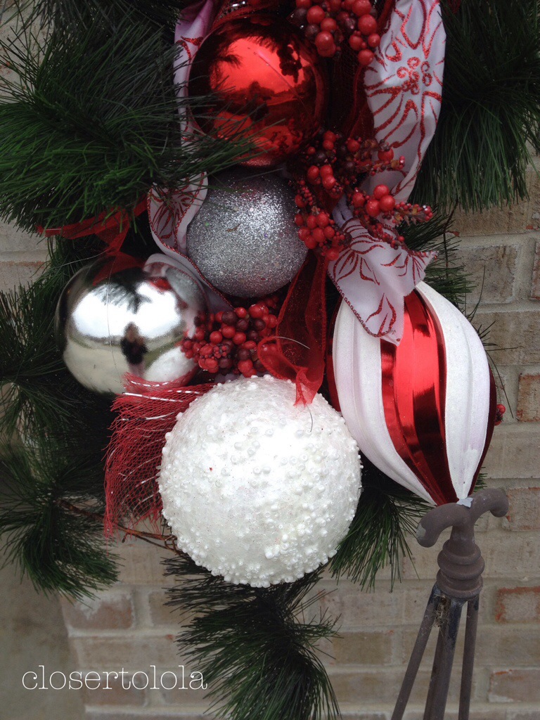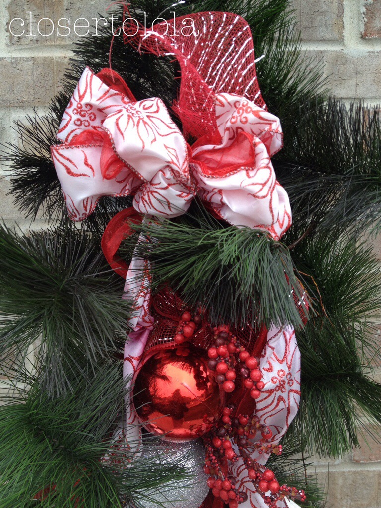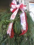 Posted: 2013/11/25 | Author: Lola | Filed under: Decorating | Tags: cheap outdoor holiday greenery, christmas diy swags, holiday decor, ornament swags | Leave a commentRemember last year when I got an old artificial Xmas tree for free from someone? This year I used the branches from it for my Christmas outdoor coach lamp garage swags and I’ve also got them tucked into the window boxes! The theme this year is red, white and some silver with snowflakes. How is your holiday decorating coming along? Any neat ideas you’ve seen lately?