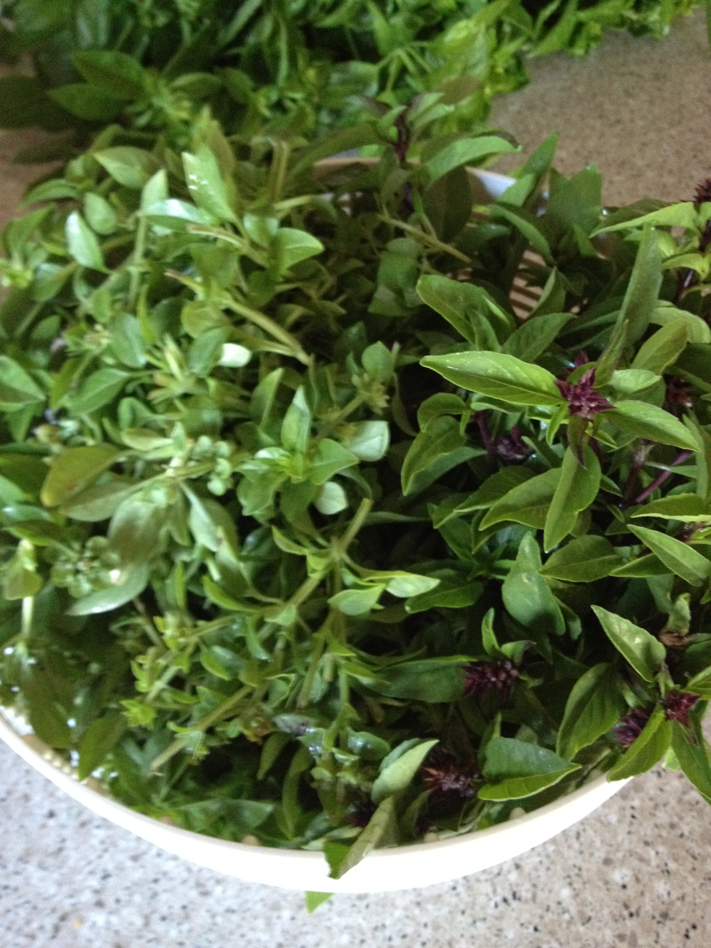 Posted: 2012/07/29 Filed under: Gardening | Tags: spicy globe basil, Sweet Italian basil, Thai basil 1 CommentI gave three kinds of Basil a haircut this morning. Babu will now commence to making pesto.