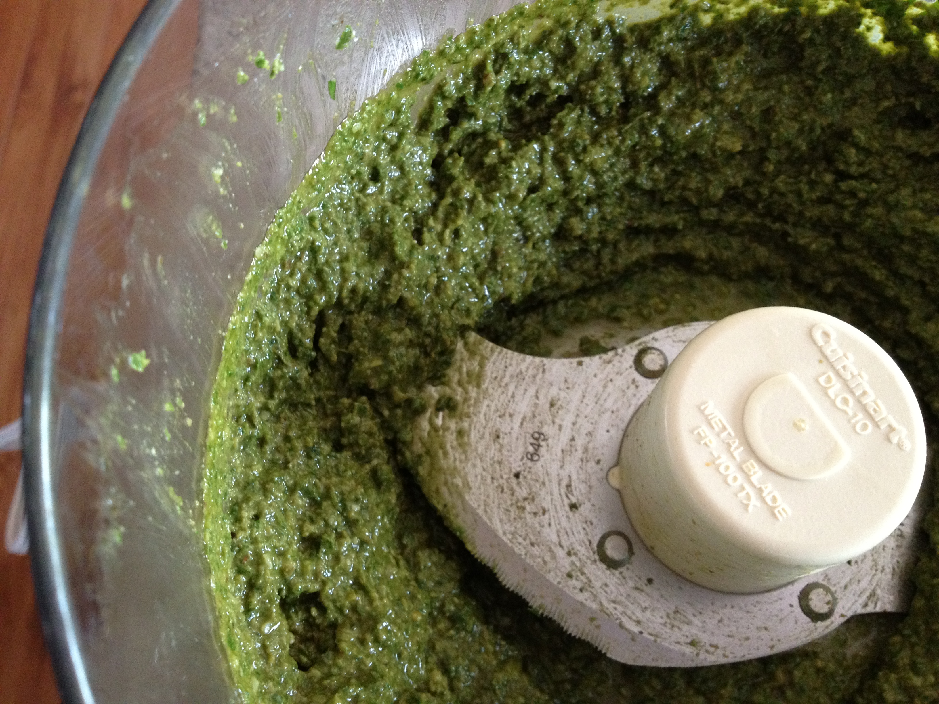 We use the food processor, cram all the crap in there except for the oil, then turn it on and give a bit to start blending, then add the oil through the top until it gets to the consistency we prefer and starts to come together. We then dole this mixture out into ice-cube trays or small, no more than 2 cup, glass or plastic freezer safe containers and freeze. The cubes get busted out of the trays and put into Ziploc freezer bags, the jars go straight into the freezer. Pesto is a bit like Guacamole in that the Basil oxidizes when exposed to air in the fridge and the top layer of it will turn darker than the pretty green underneath. So you don’t want to have more in the fridge that you can use within a weekish. I’m the one who lets thing go much further than him, so it’s kind of up to your own personal feelings about foods and their use by dates. I’ll eat the same leftovers for 5 lunch and dinners straight if they are good enough because that is how I cooked when I was poor and single in my 20’s. I’d make a batch of something and proceed to eat it every night for dinner and/or day for lunch until it was gone. I’m the girl who will sniff yogurt 10+ days past it’s sell by date and if it stands up to the test, go ahead and eat it. I still remember having a grocery budget of $50 a trip ( about twice a month) and going with a list, a calculator and my coupons. If I had enough left over I got a case of Diet Coke, if not decisions had to be made. But as usual I am digressing. ❤